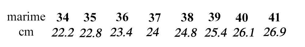 - Pentru a ne asigura ca marimea comandata ti se potriveste pentru modelul ales, dupa ce ai finalizat comanda vei fi contacatat telefonic de catre un consilier si vei primi indicatiile de masurare a talpii prin email pentru modelele realizate la comanda
