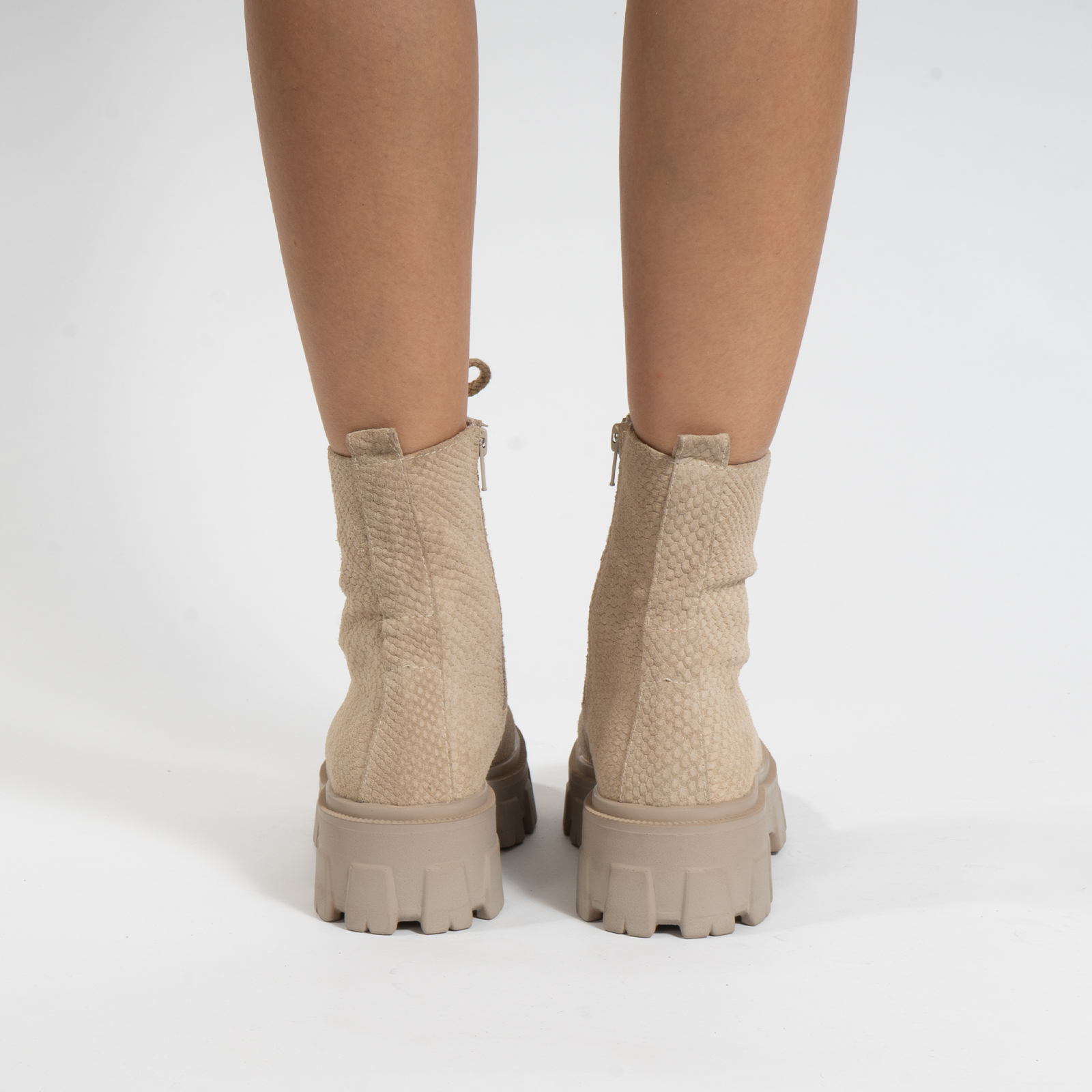 Bocanci cu siret, din piele naturala bej, cu presaj de sarpe. Pentru o incaltare mai usoara, bocancii sunt prevazuti cu fermoar pe lateralul interior a piciorului.