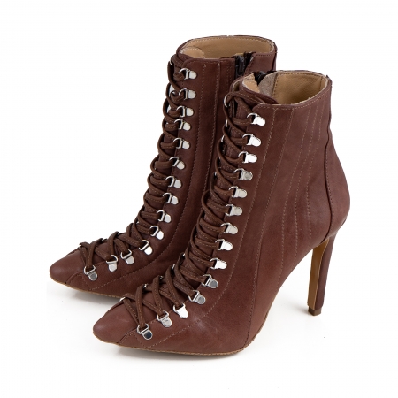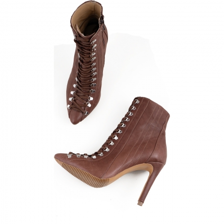 Botine Stiletto cu siret si capse metalice, din piele naturala maron. Brantul gheteleor este acoperit cu burete pentru un plus de confort .