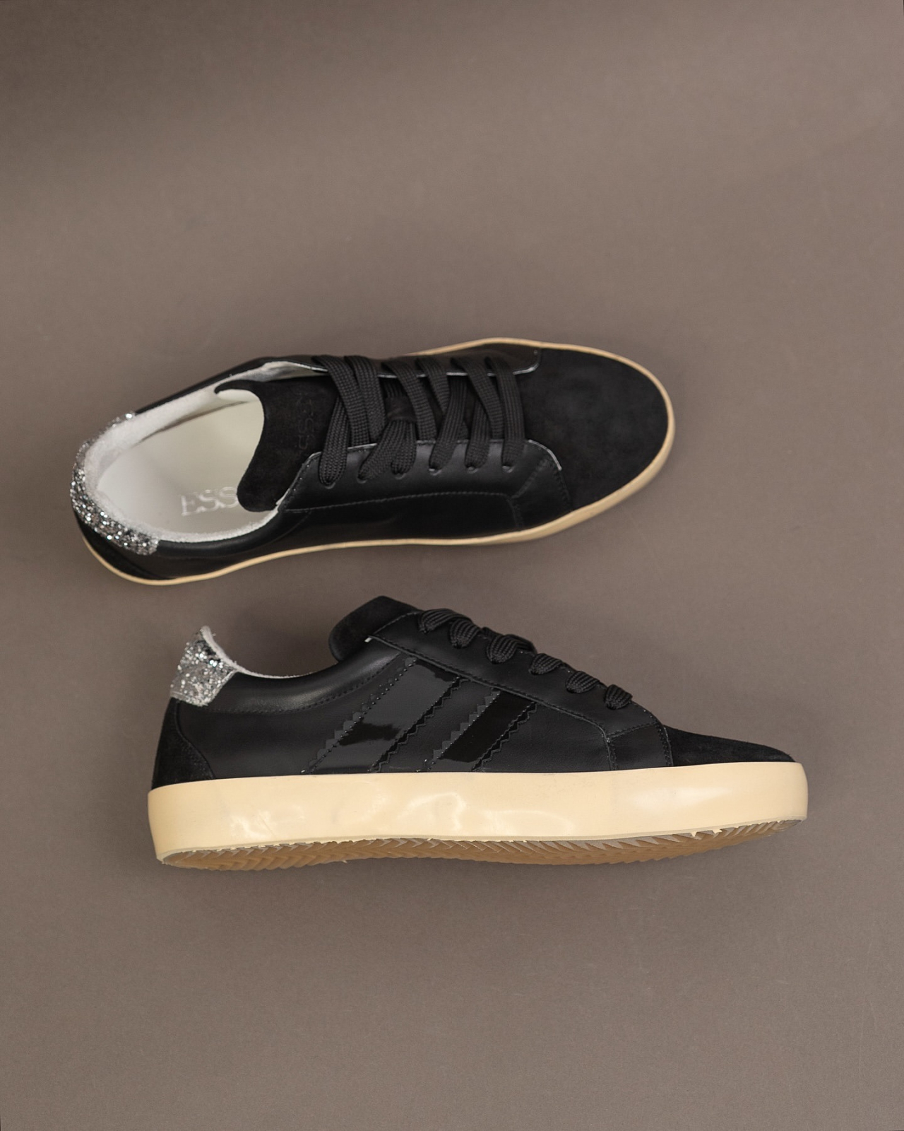 Un model timeless, reinterpretat, in varianta din piele naturala neagra, cu doua dungi laterale din piele naturala neagra lacuita si cu glittter argintiu la calcai. Talpa bej galbui accentueaza forma clasic/moderna a pantofului