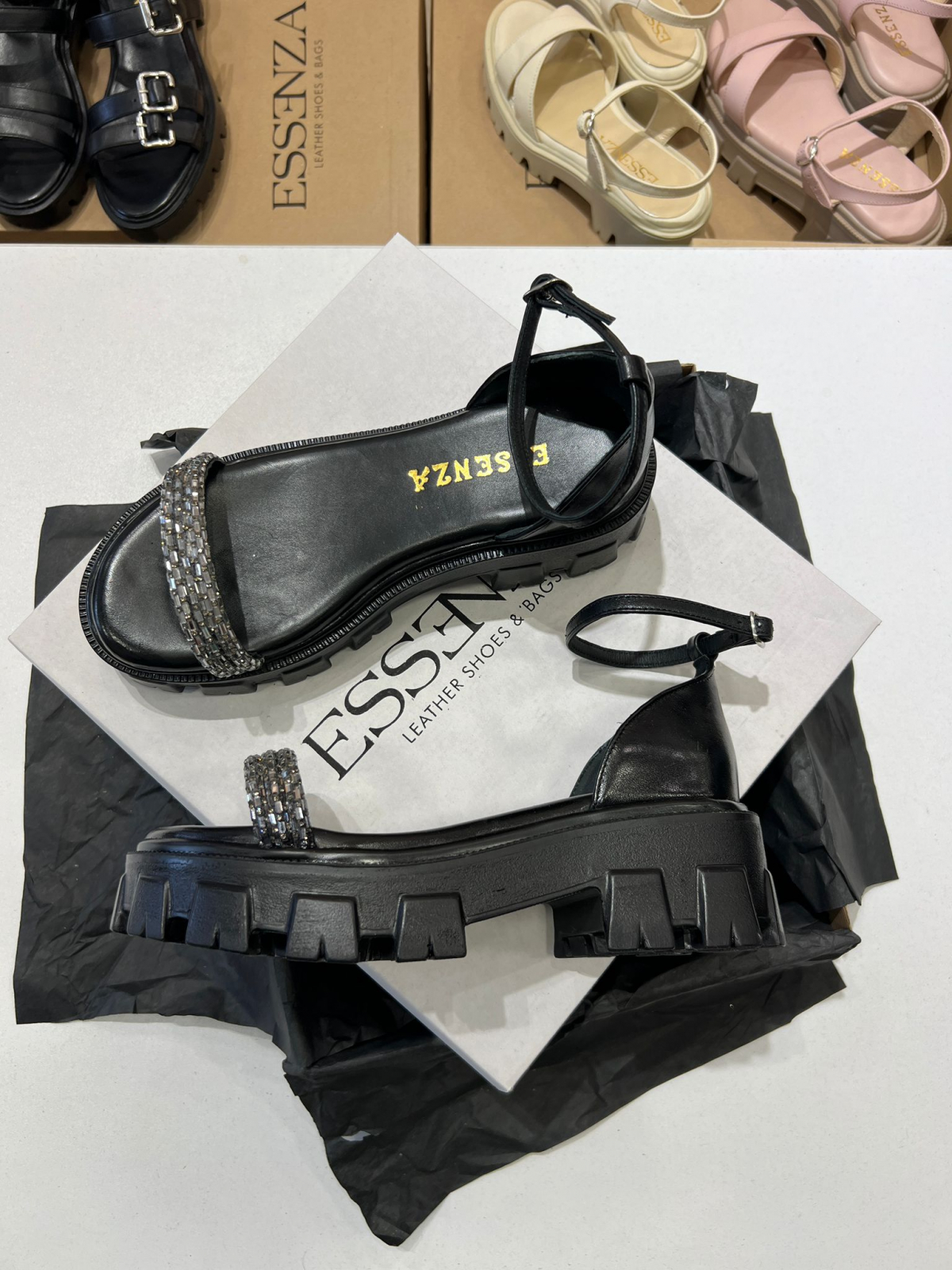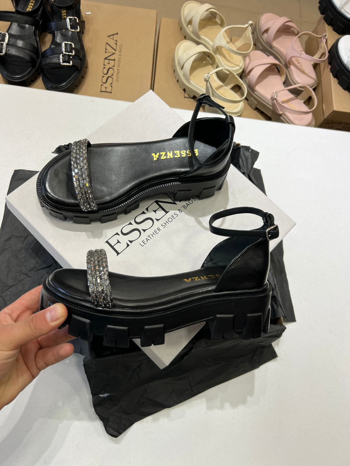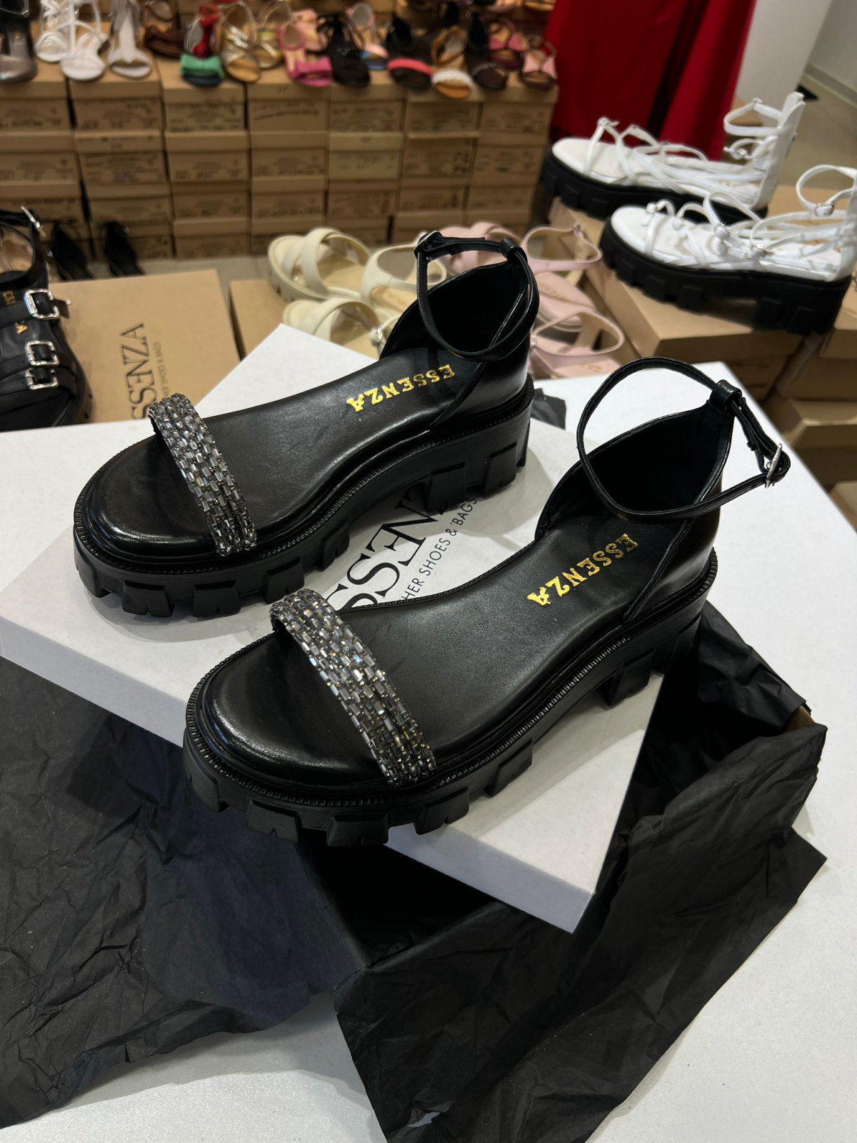 Sandale cu talpa groasa si barete cristal, din piele naturala, negru box