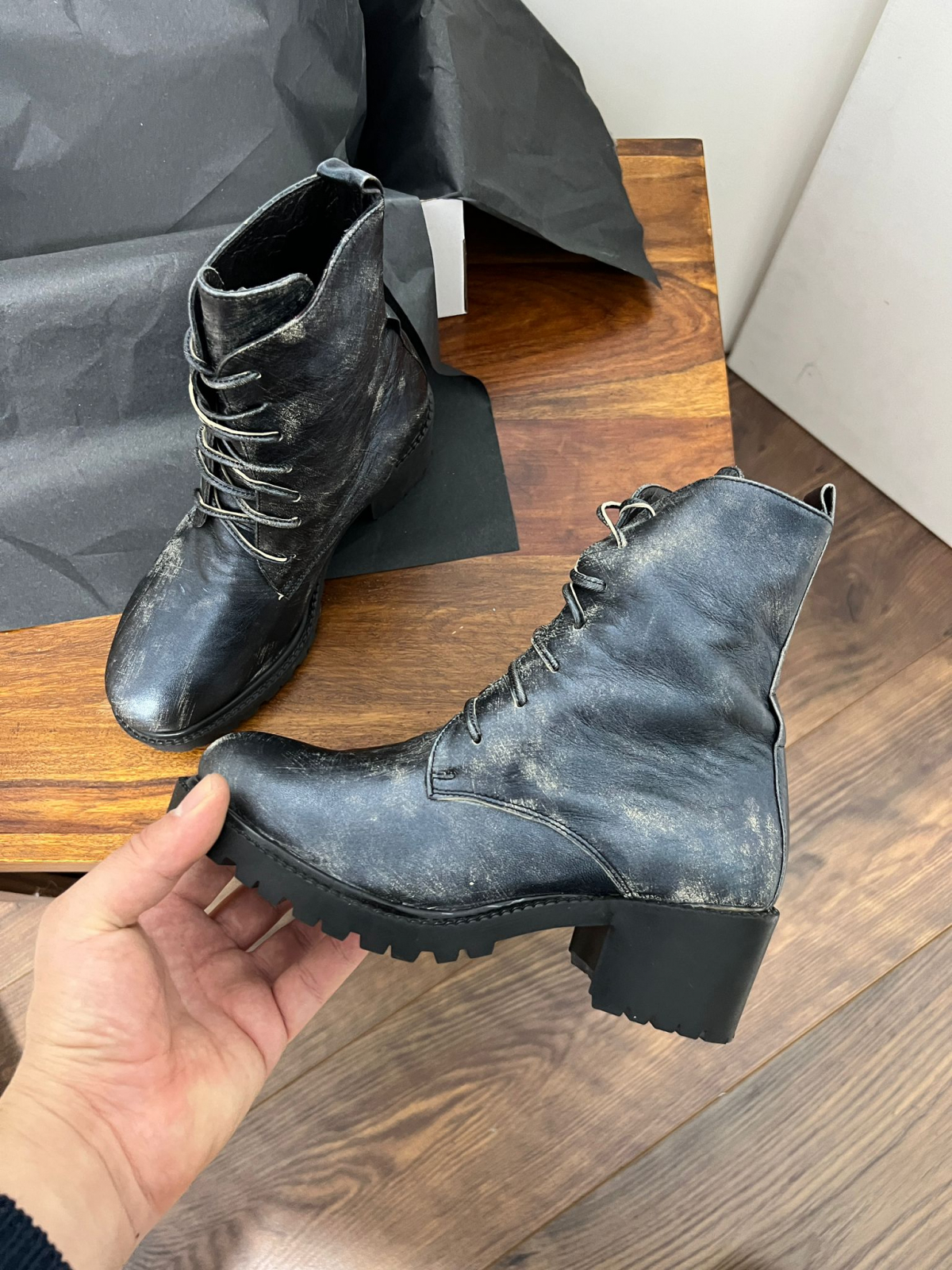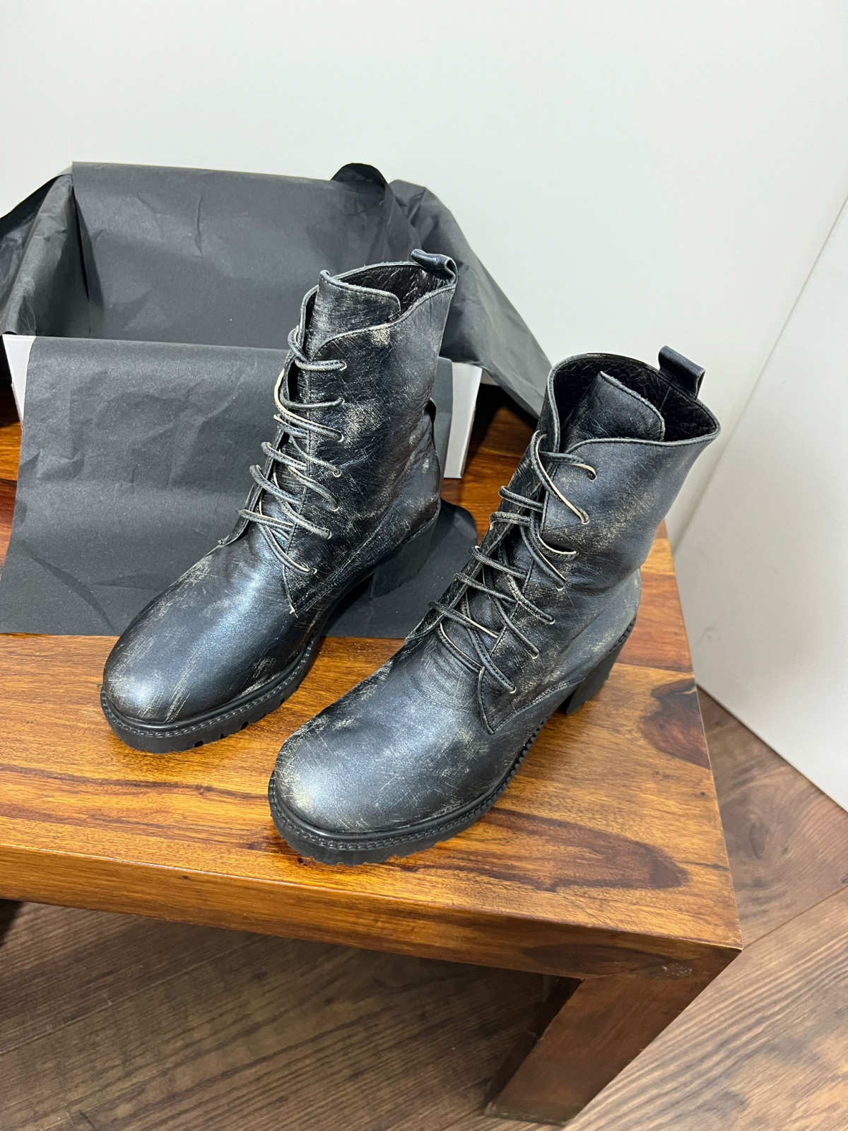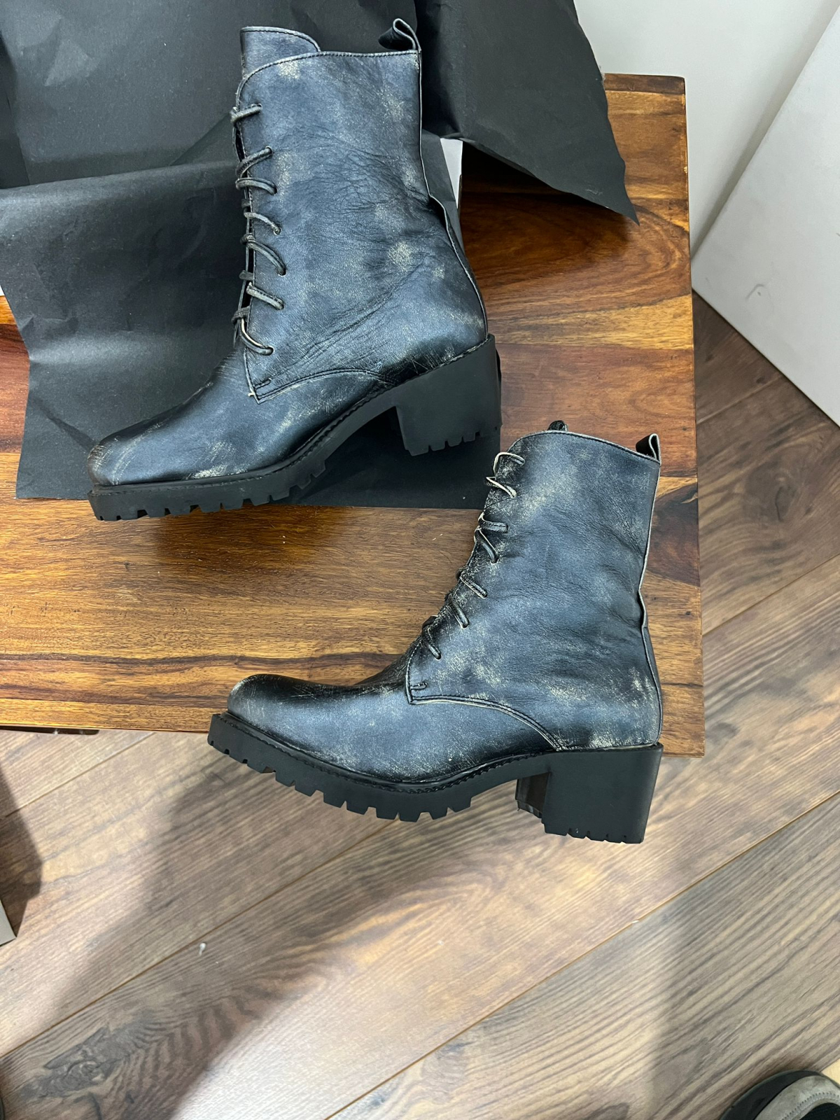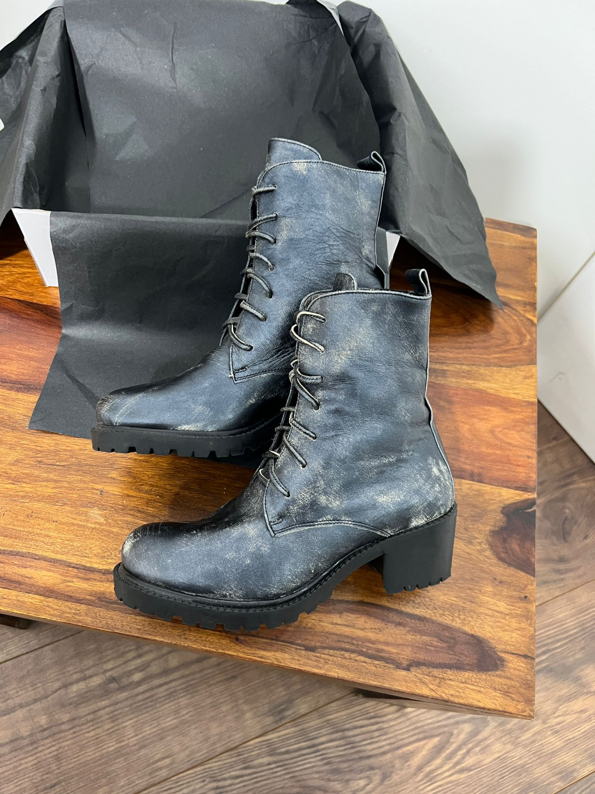 Bocanci cu siret, din piele metalizata albastra, patinata