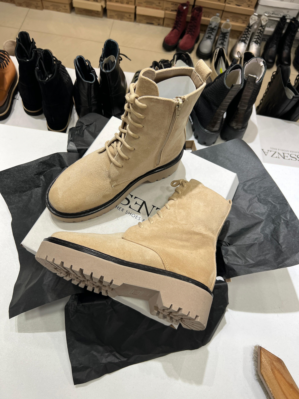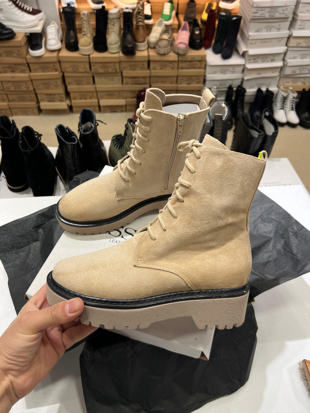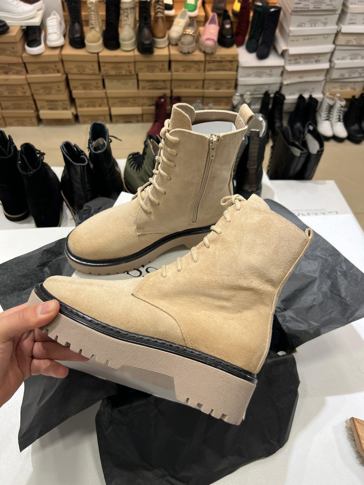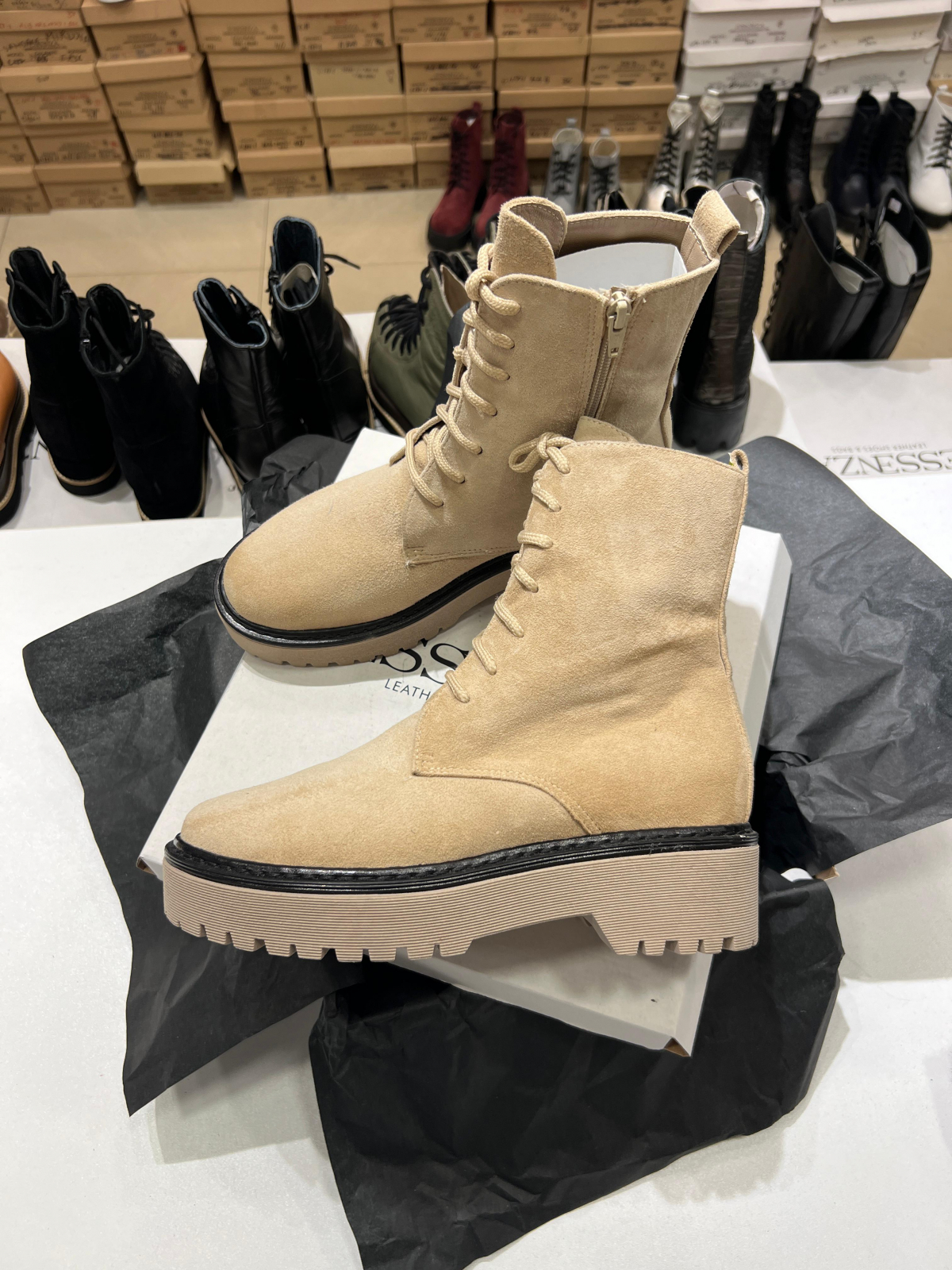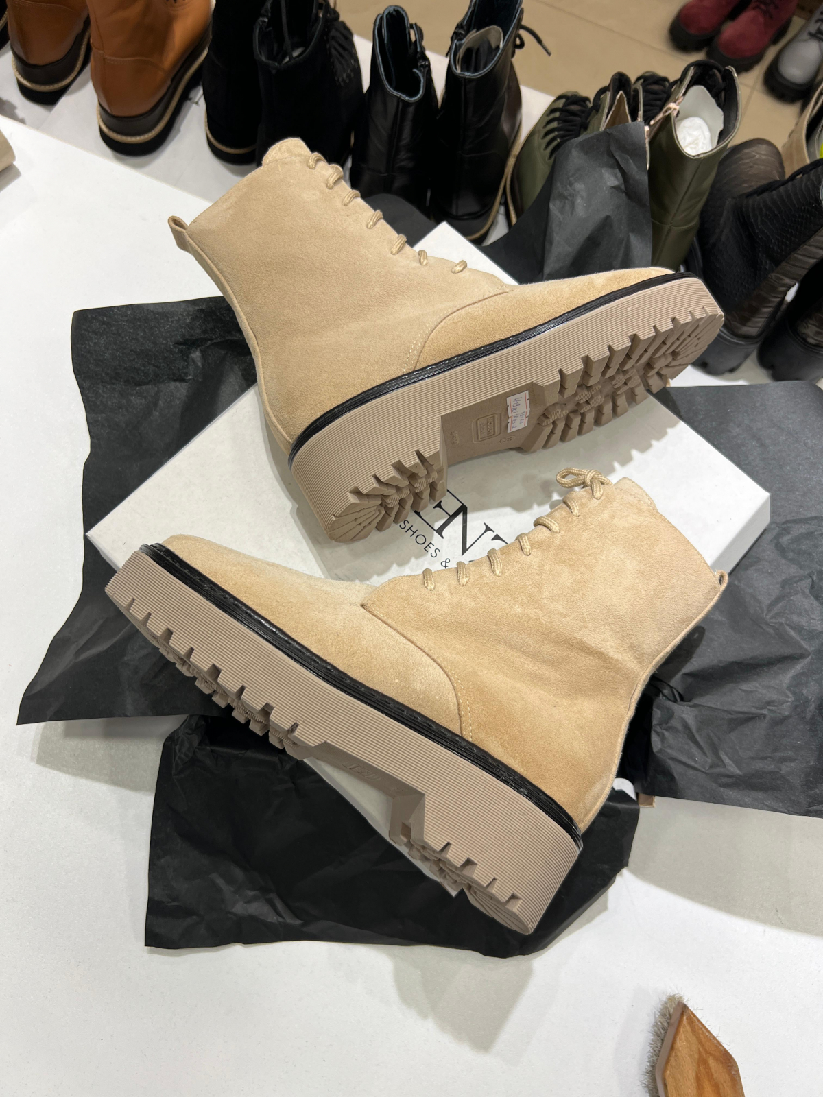 Bocanci cu siret, din piele naturala intoarsa bej si talpa bej cu rama neagra. Pentru o incaltare mai usoara, bocancii sunt prevazuti cu fermoar pe lateralul interior a piciorului.