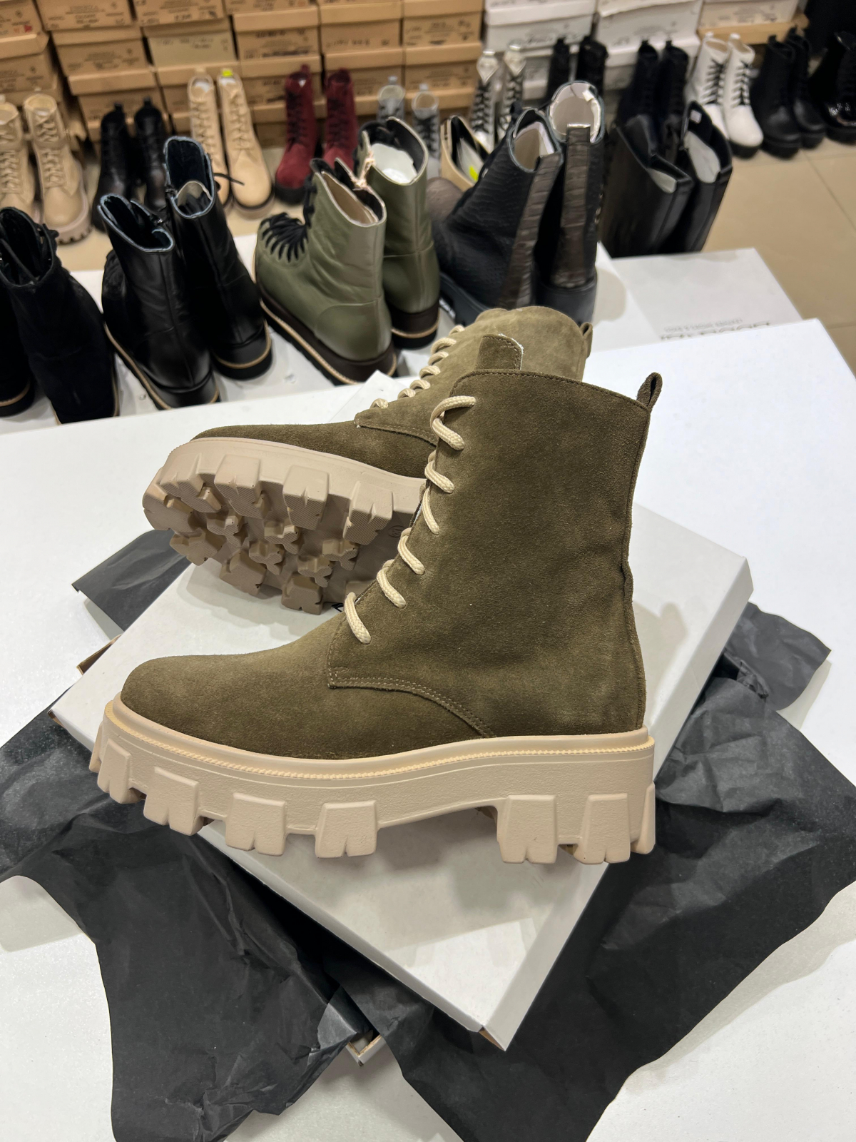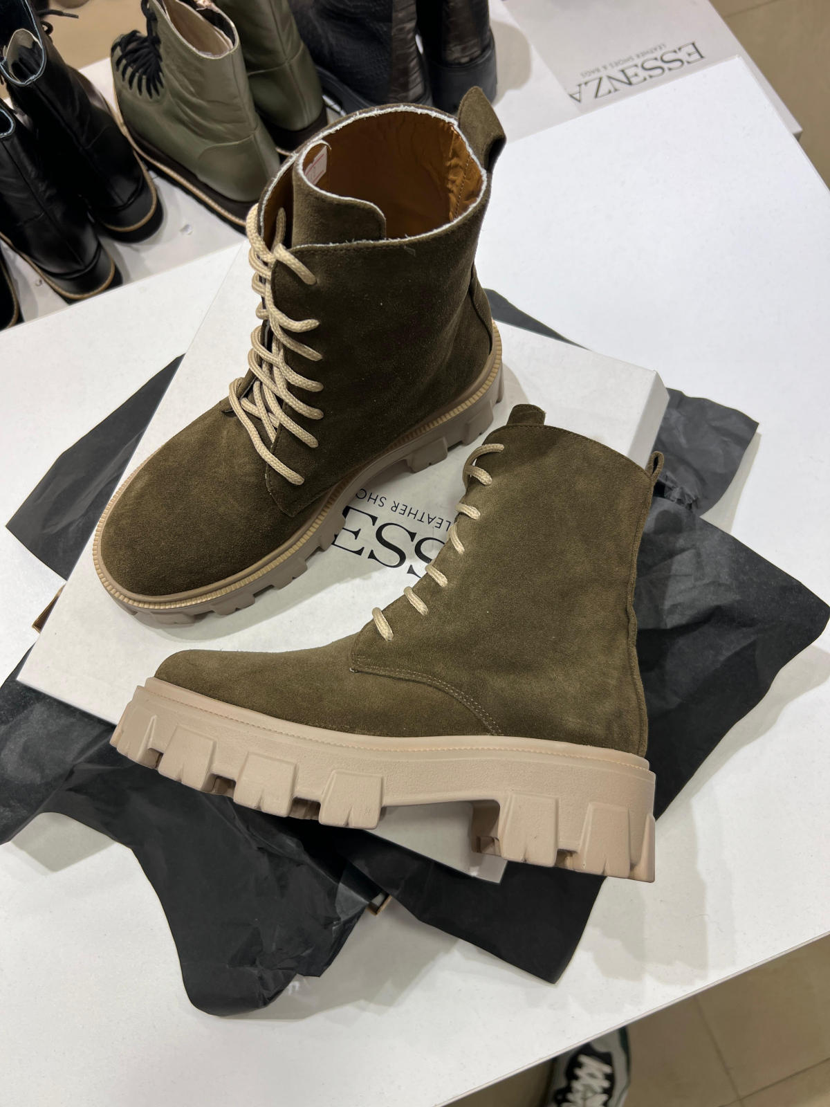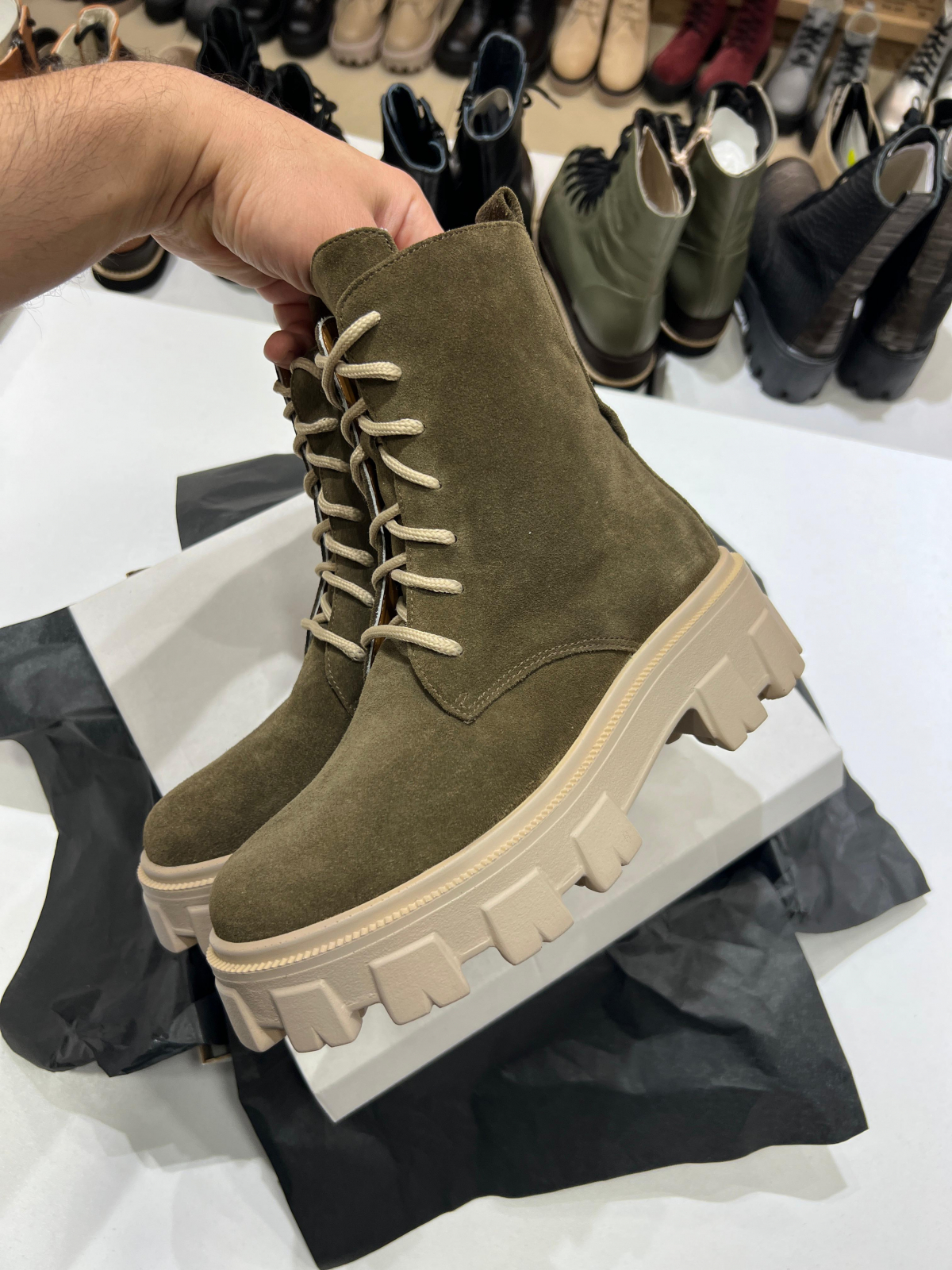 Bocanci cu siret, din piele naturala intoarsa cafenie. Pentru o incaltare mai usoara, bocancii sunt prevazuti cu fermoar pe lateralul interior a piciorului.