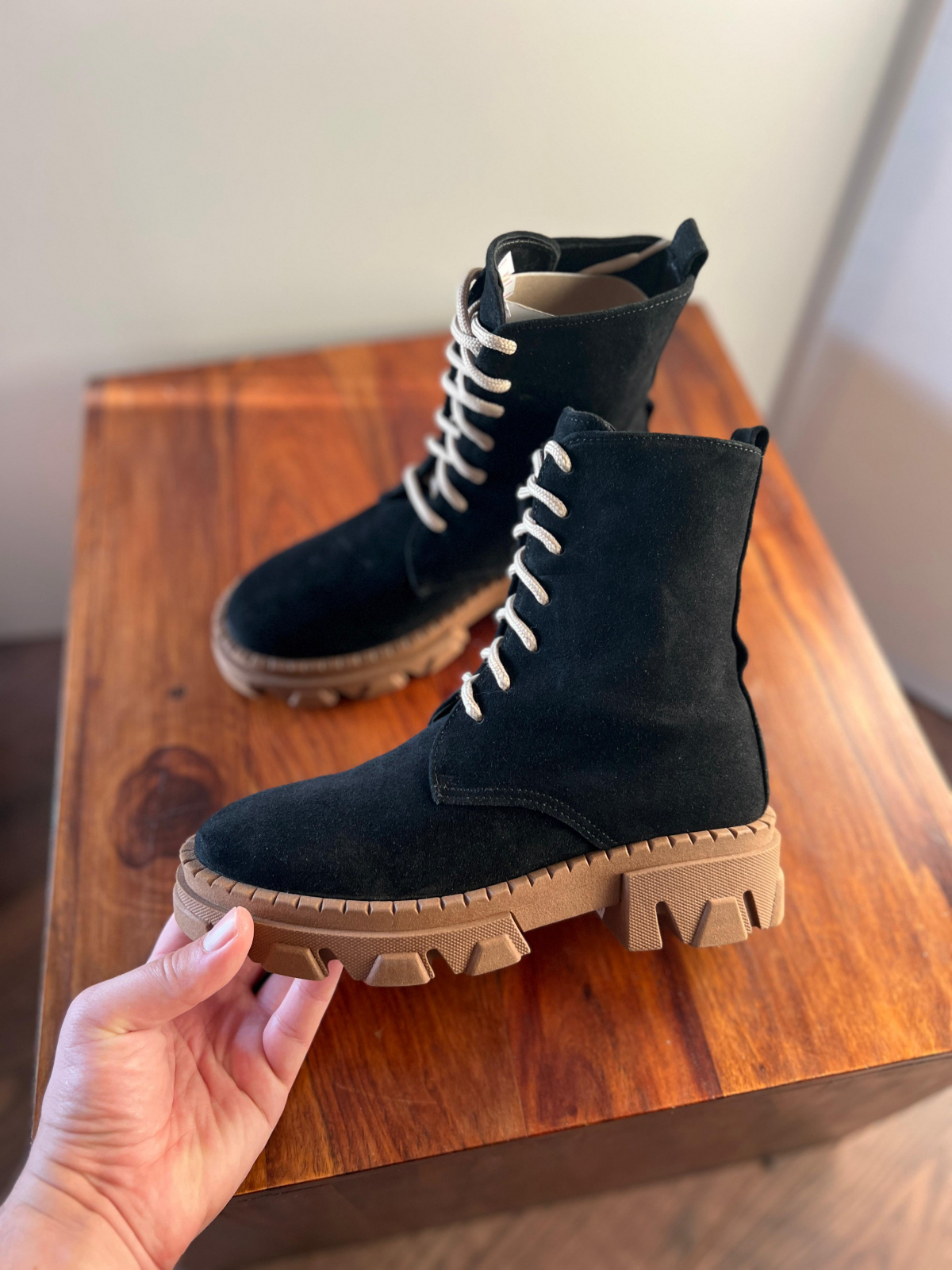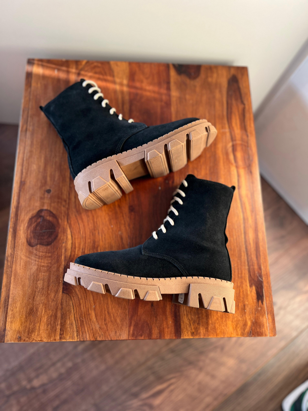 Bocanci cu siret, din piele naturala intoarsa neagra. Brantul este acoperit integral cu burete, pentru un plus de confort.