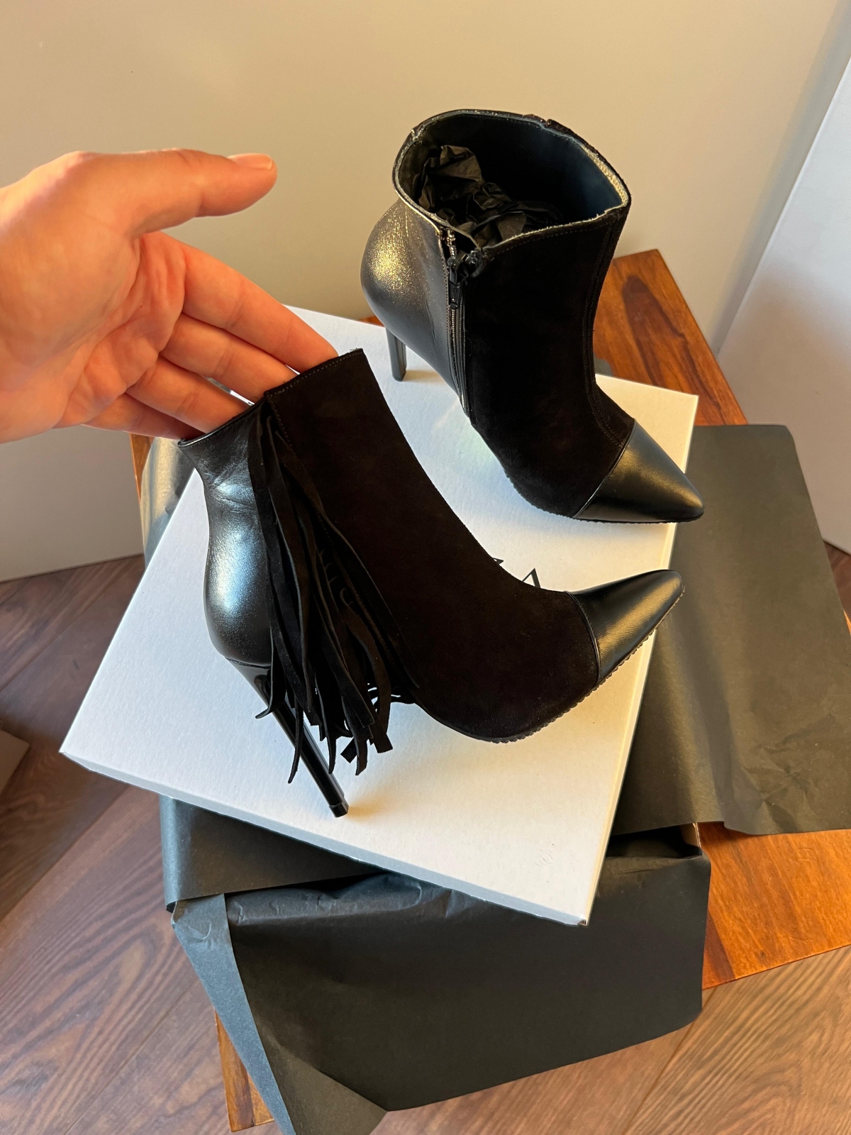 Botine Stiletto din piele intoarsa neagra si piele normala,accesorizate cu franjuri pe partea de lateral exterior.Cu un design deosebit,aceste botine au brantul acoperit cu burete pentru un plus de confort.
