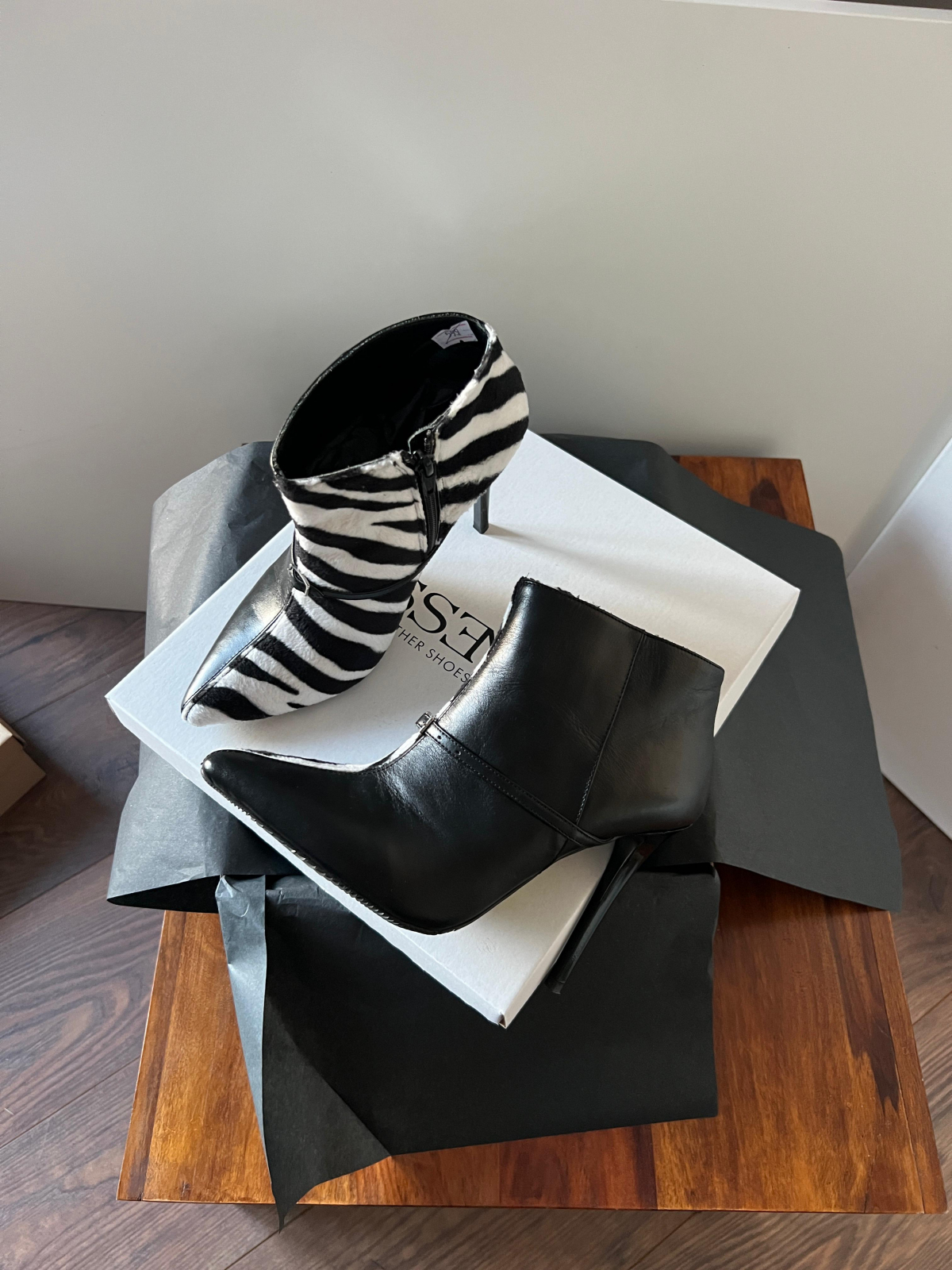 Botine Stiletto din piele neagra si piele de ponei cu animal print, accesorizate cu bareta peste rist.Brantul botinelor este acoperit cu burete pentru un plus de confort.