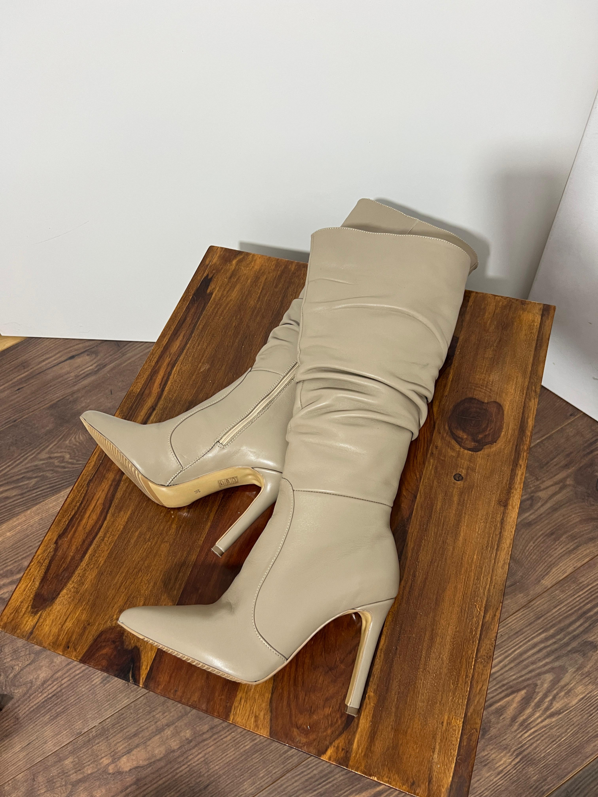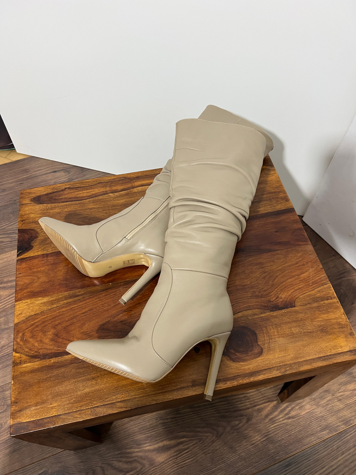 Cizme cu varf ascutit, cu pliuri, din piele naturala bej. Barntul este acoperit integral cu burete, adaugand un plus de confort. Inchiderea se face cu fermoar interior
