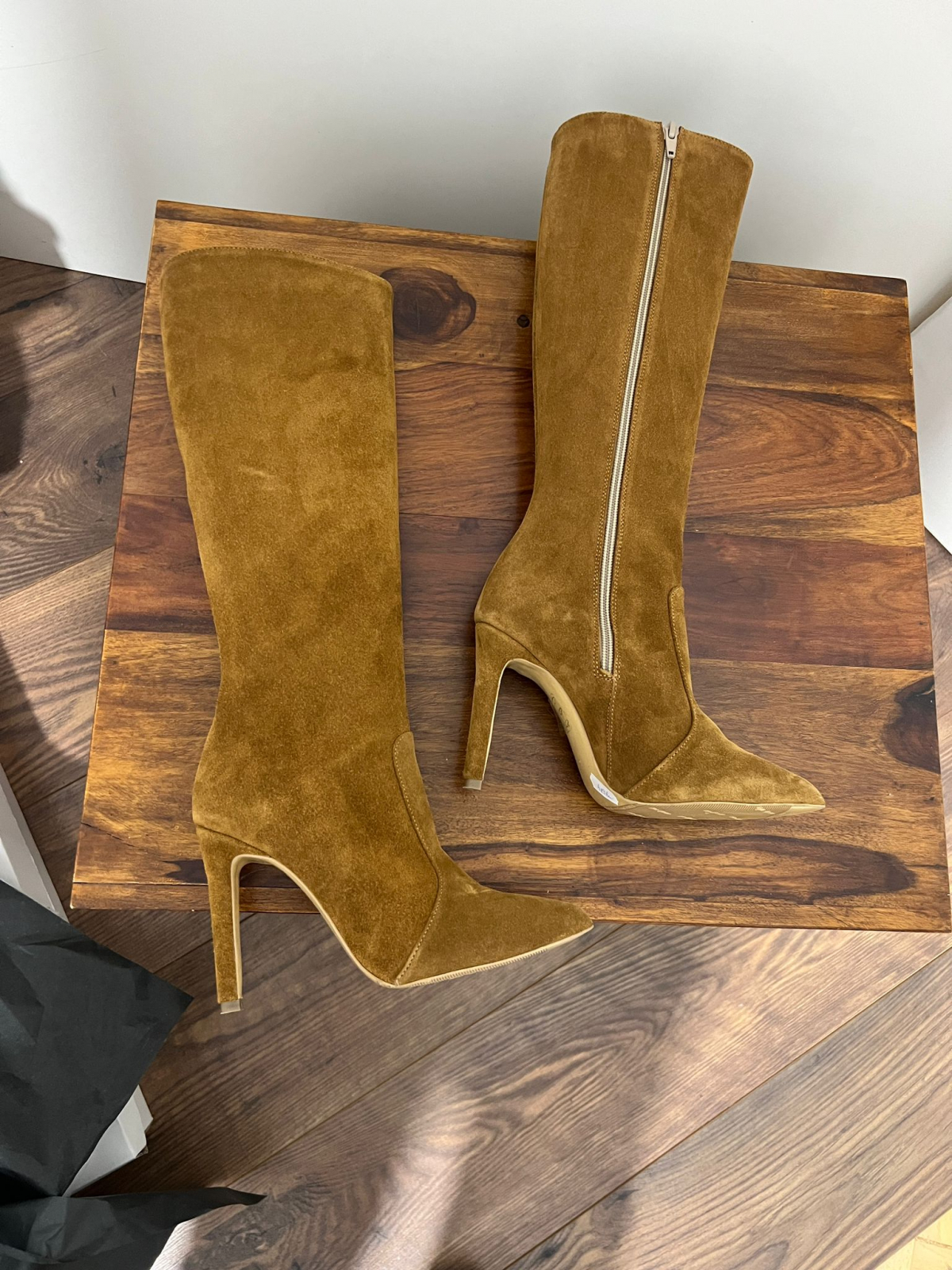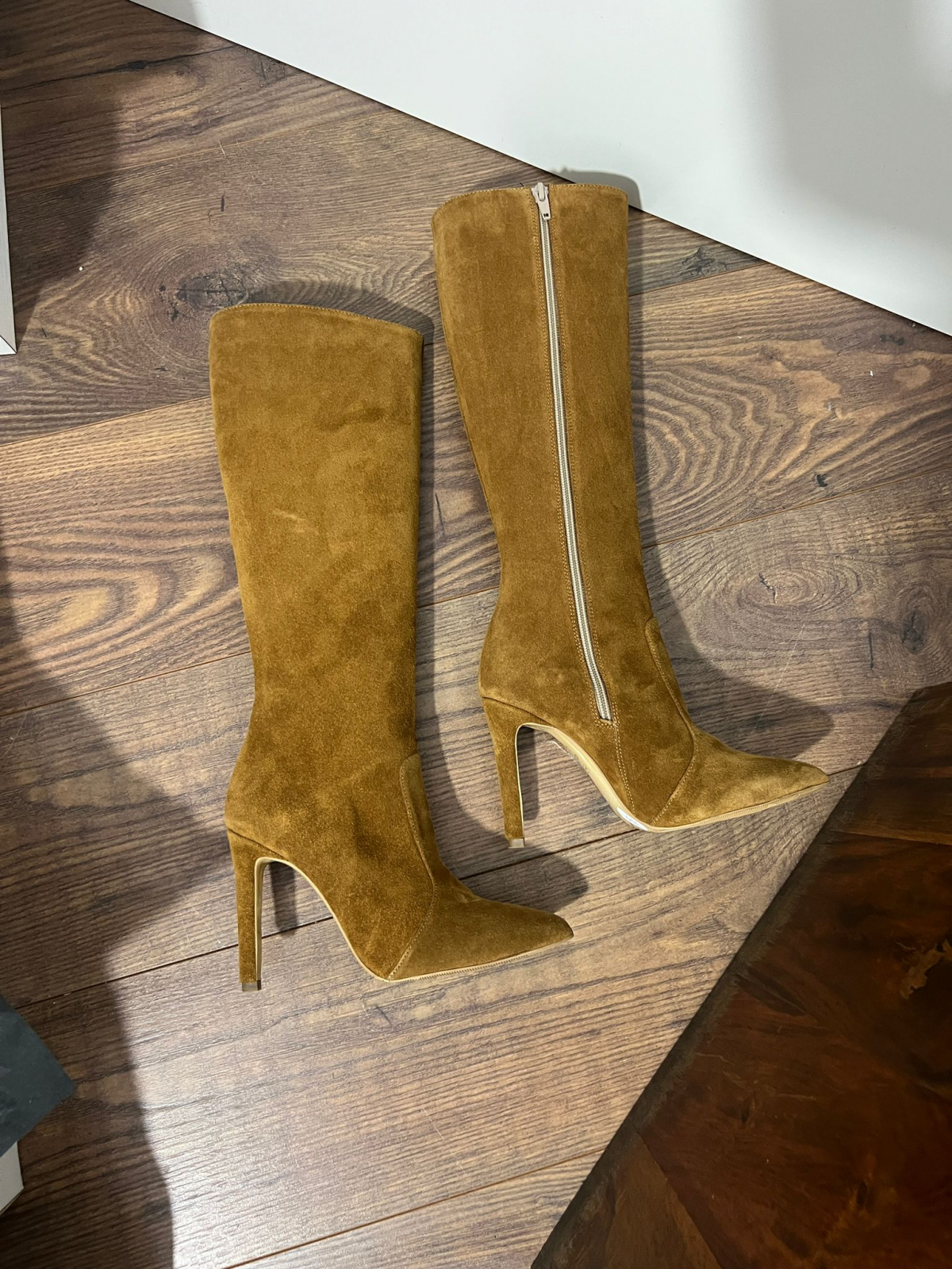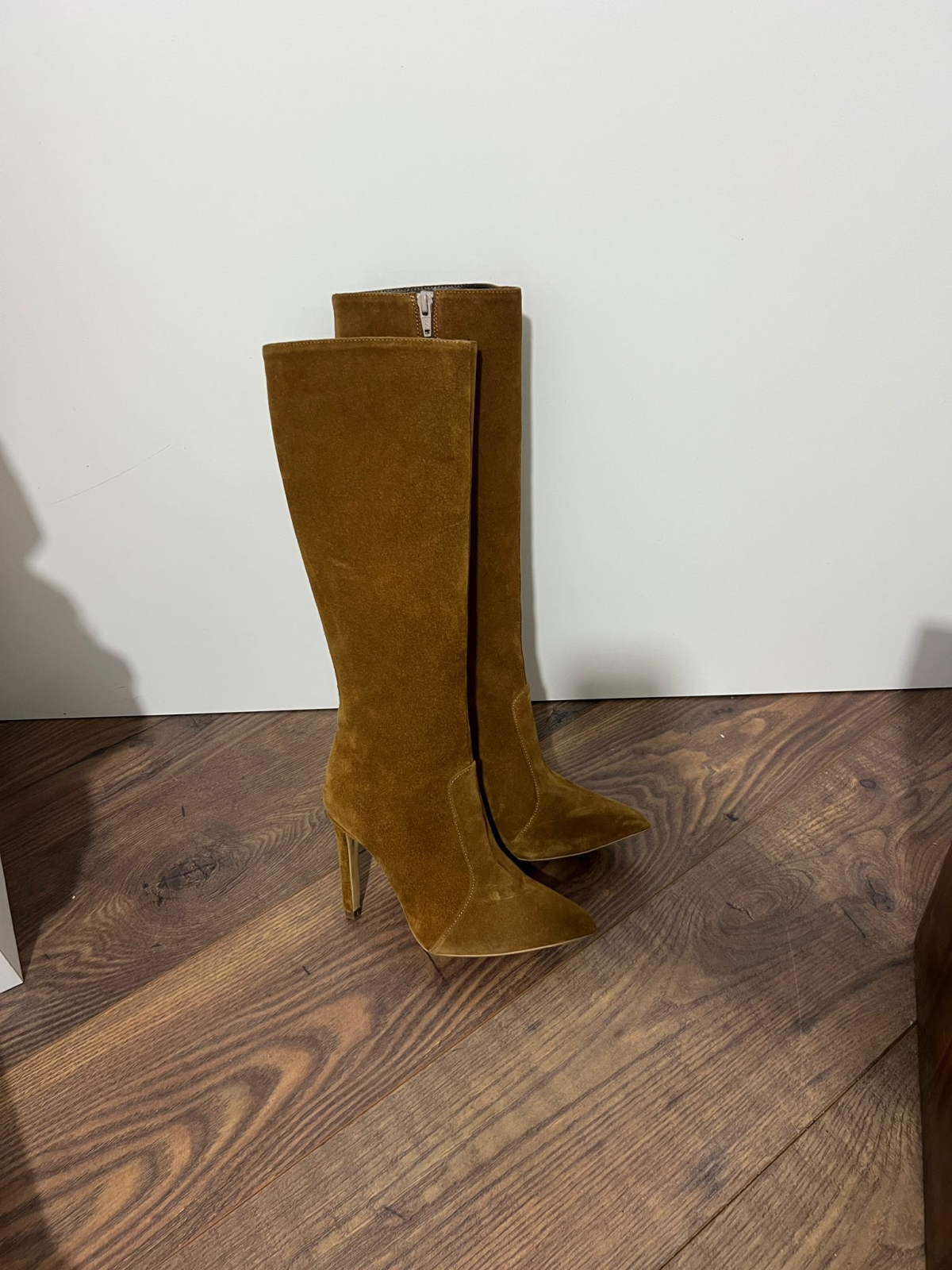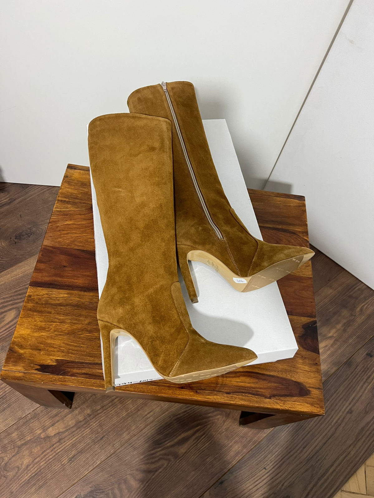 Cizme cu varf ascutit, din piele naturala intoarsa maron roscat. Barntul este acoperit integral cu burete, adaugand un plus de confort