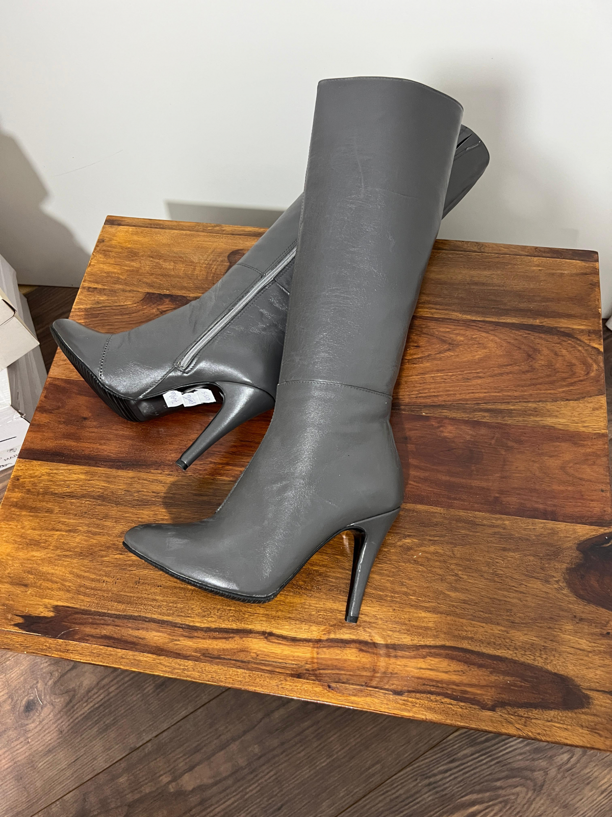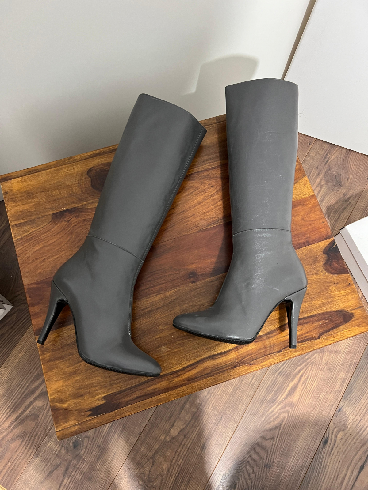 Cizme cu varf semiascutit, din piele naturala gri inchis. Talpa este antiderapanta iar brantul este acoperit cu burete, oferind un plus de confort