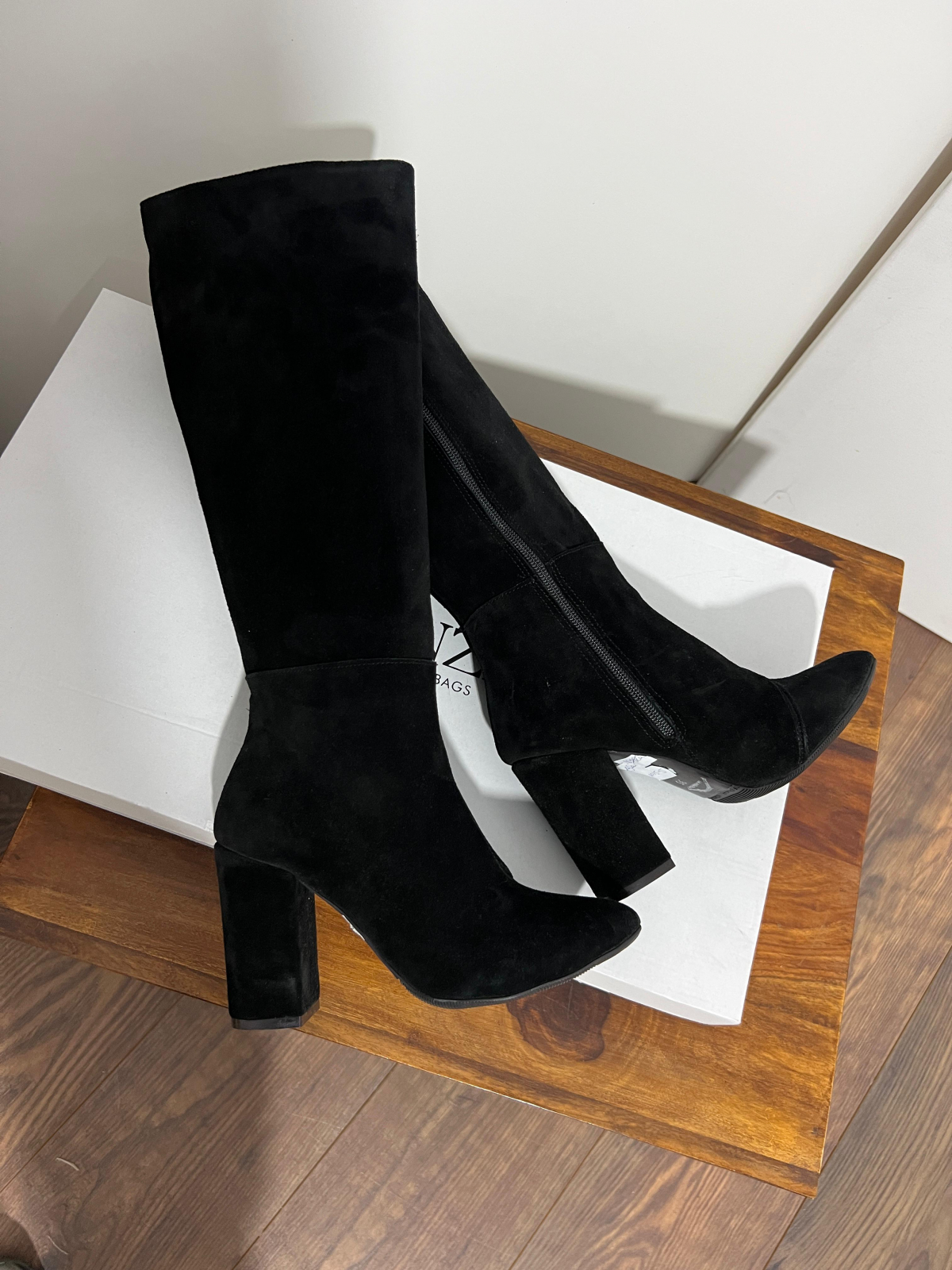 Cizme din piele naturala intoarsa, cu toc gros de 8.5 cm. Talpa este antiderapanta iar brantul este acoperit cu burete, oferind un plus de confort