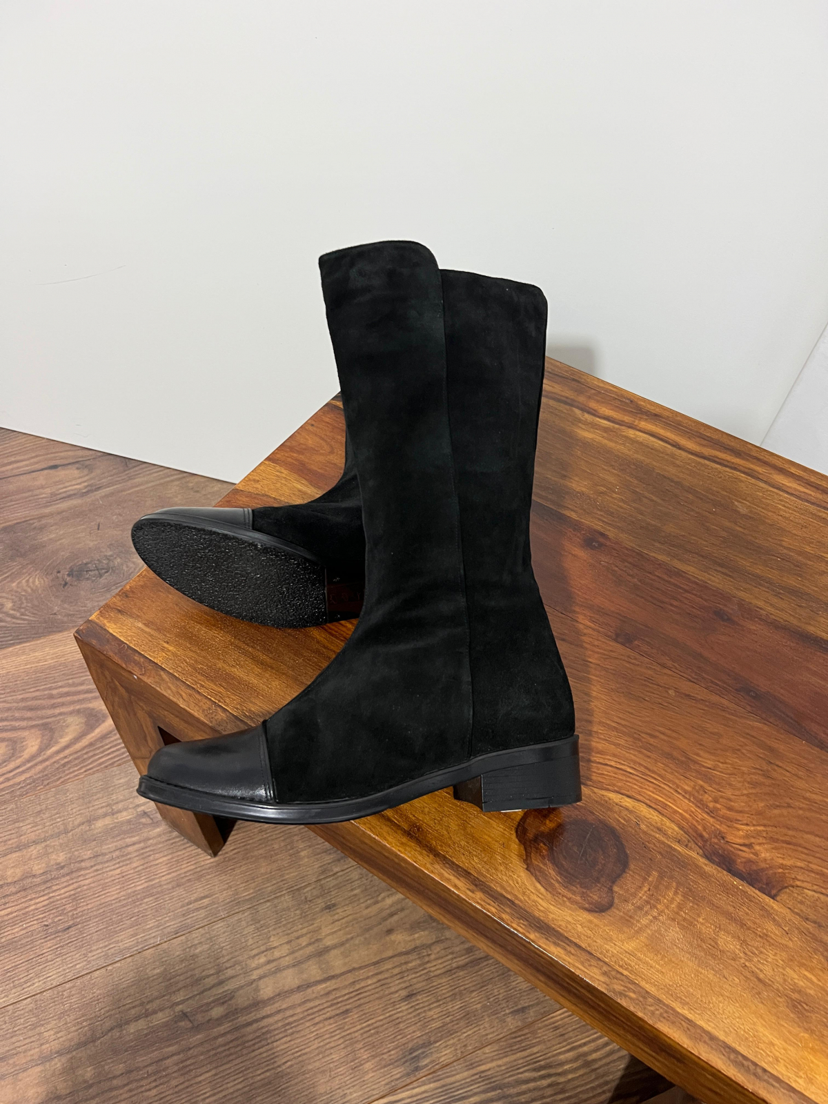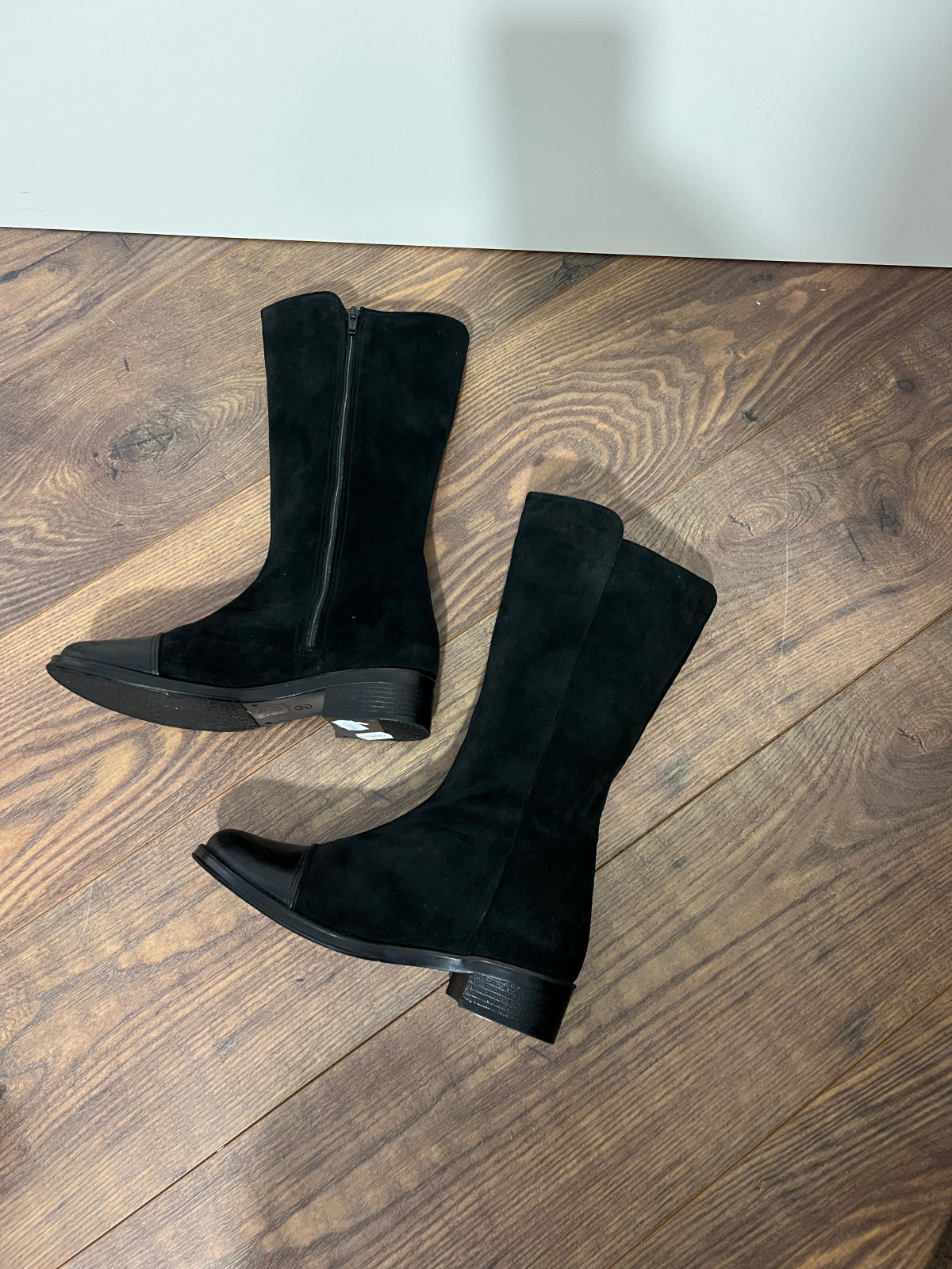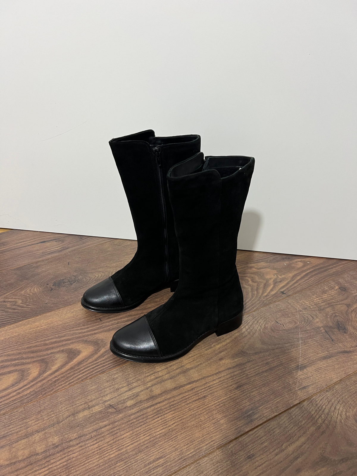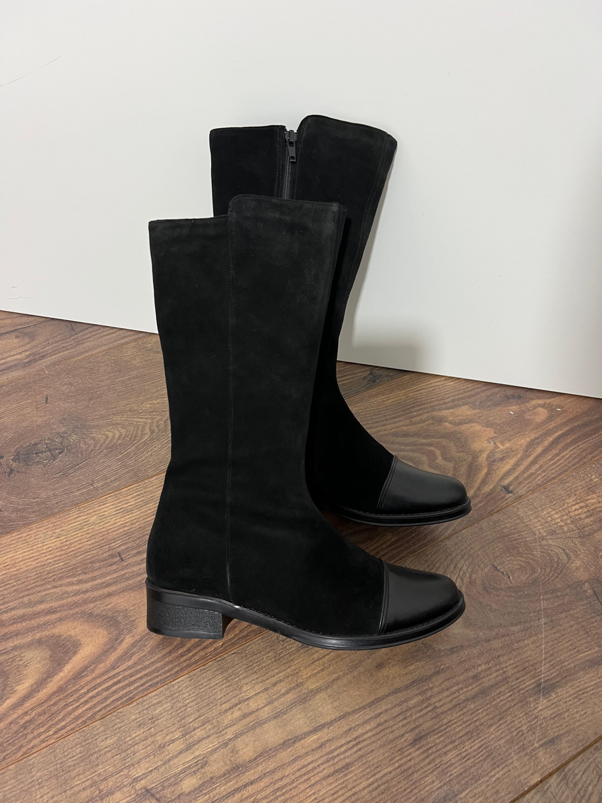 Cizme din piele naturala neagra. Design modern, combinatie de texturi de peiel intoarsa si piele box, practice si comode, cu talpa antiderapanta, aceste cizme sunt potrivite pentru a fii purtate la o multitudine de tinute, cu pantoloni sau fusta.
