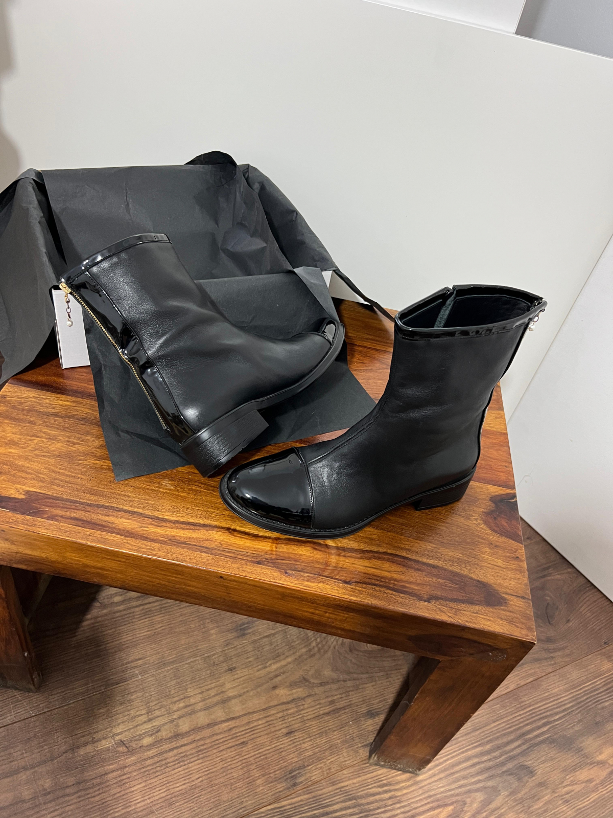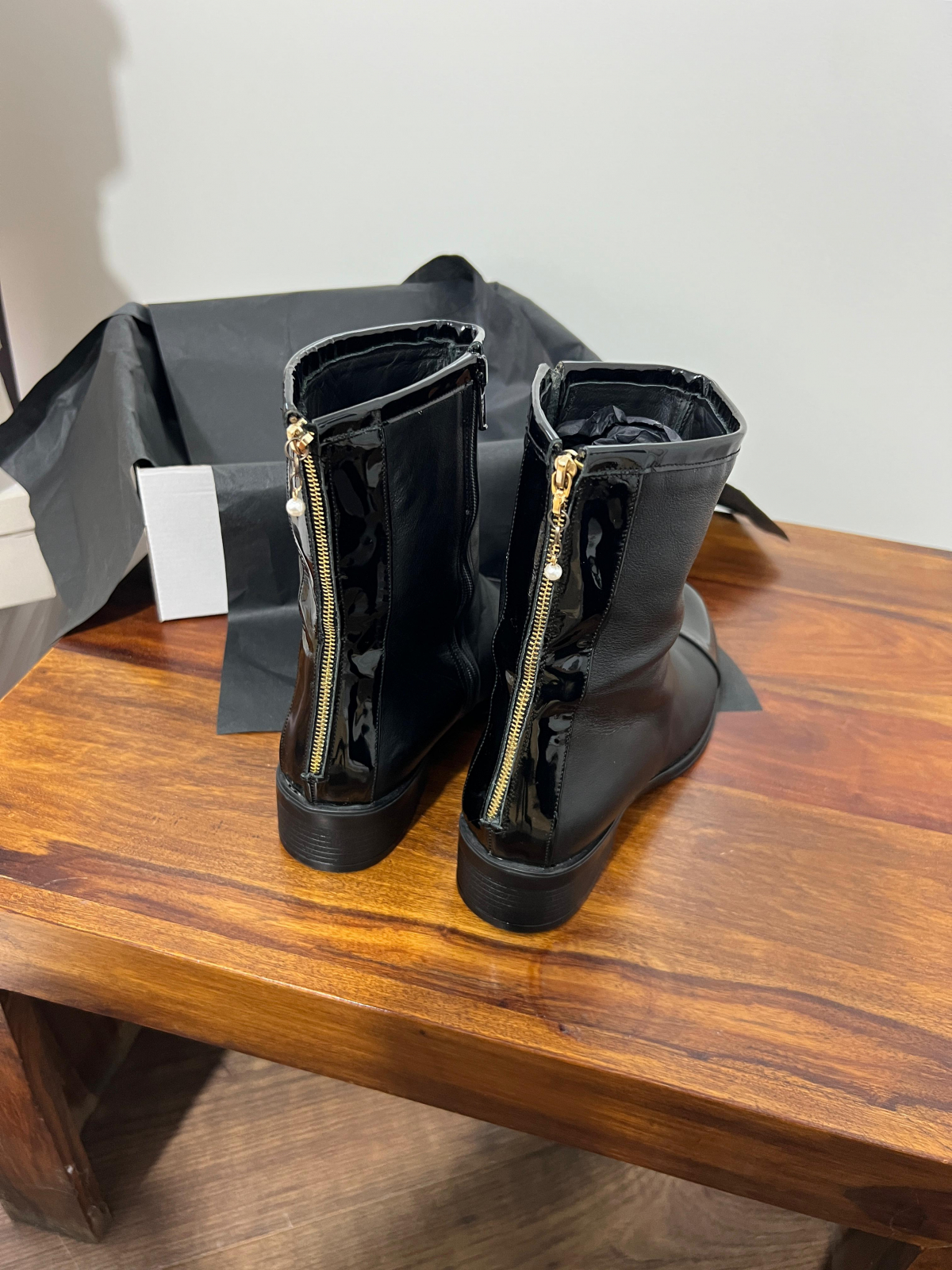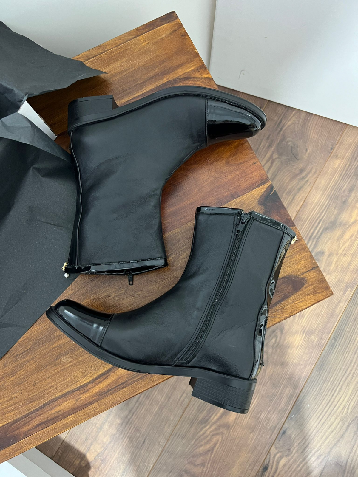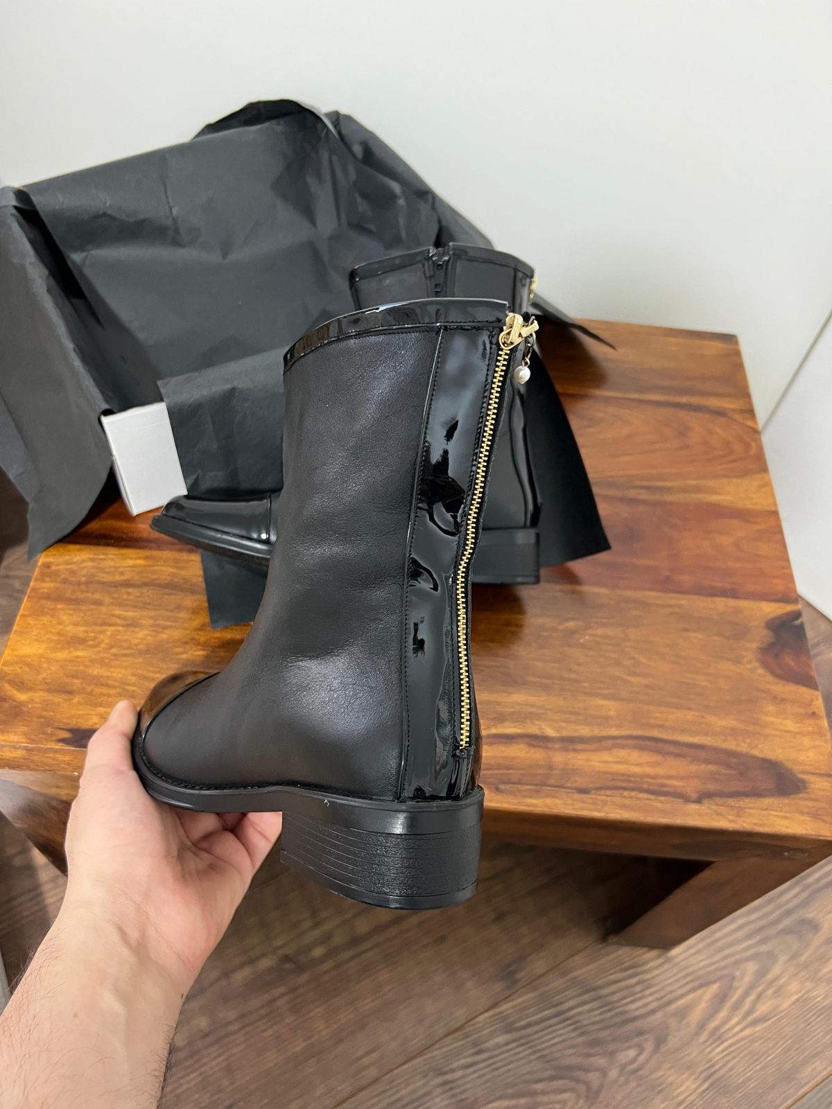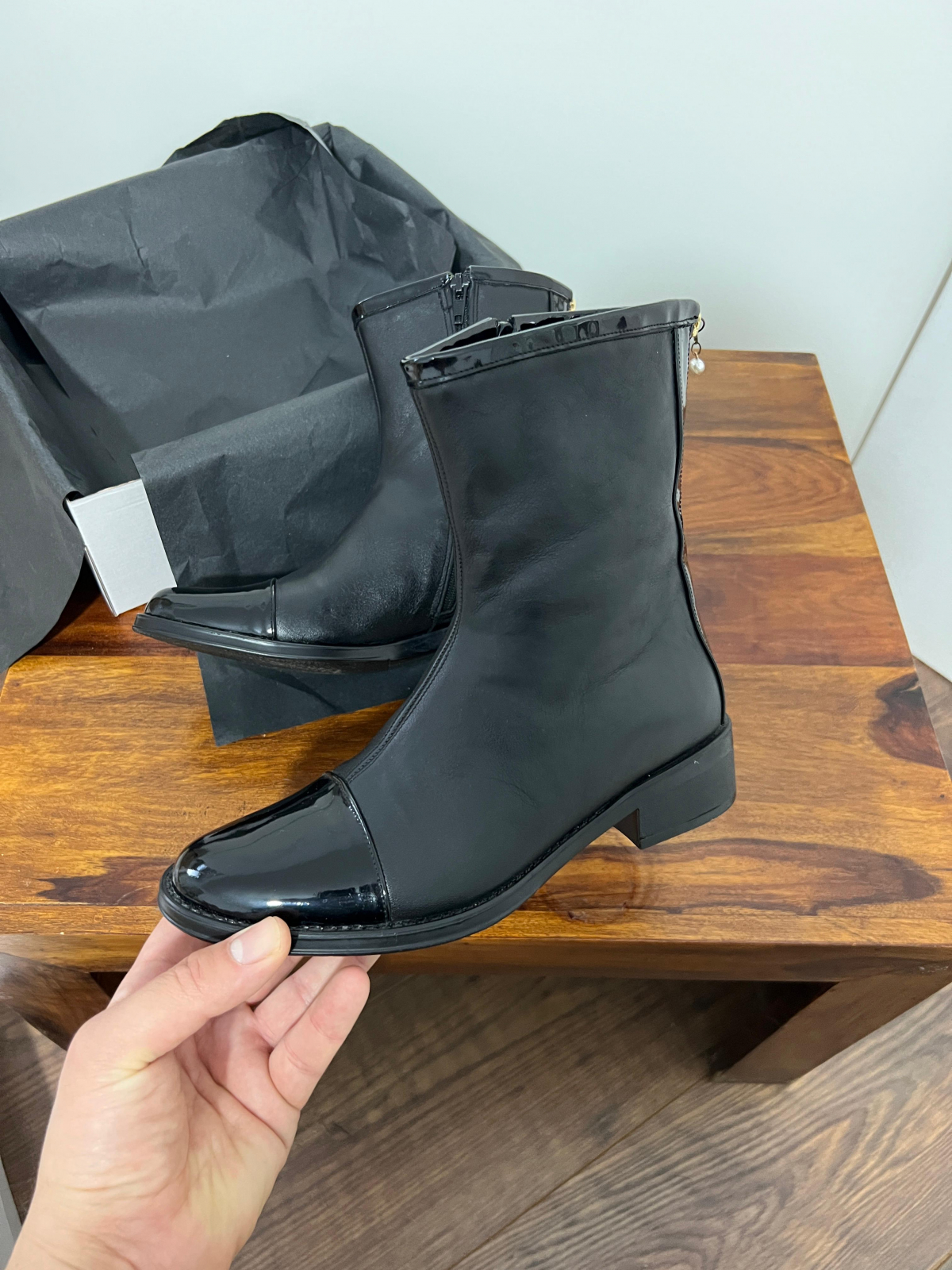 Cizme din piele neagra si piele neagra box si lac , cu talpa joasa.