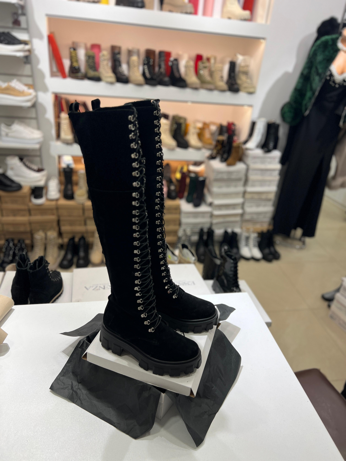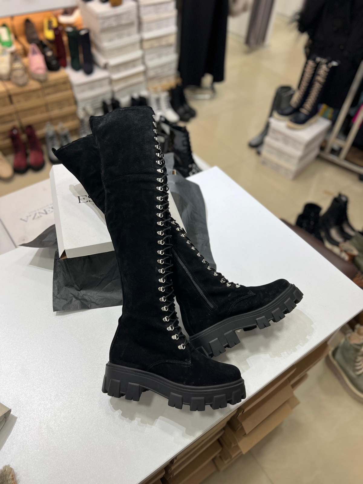 Cizme peste genunchi, cu talpa inalta tip bocanc, din piele naturala intoarsa neagra. Foarte practice si comode cu talpa antiderapanta, aceste cizme sunt potrivite pentru a fii purtate de-a lungul intregului sezon rece.