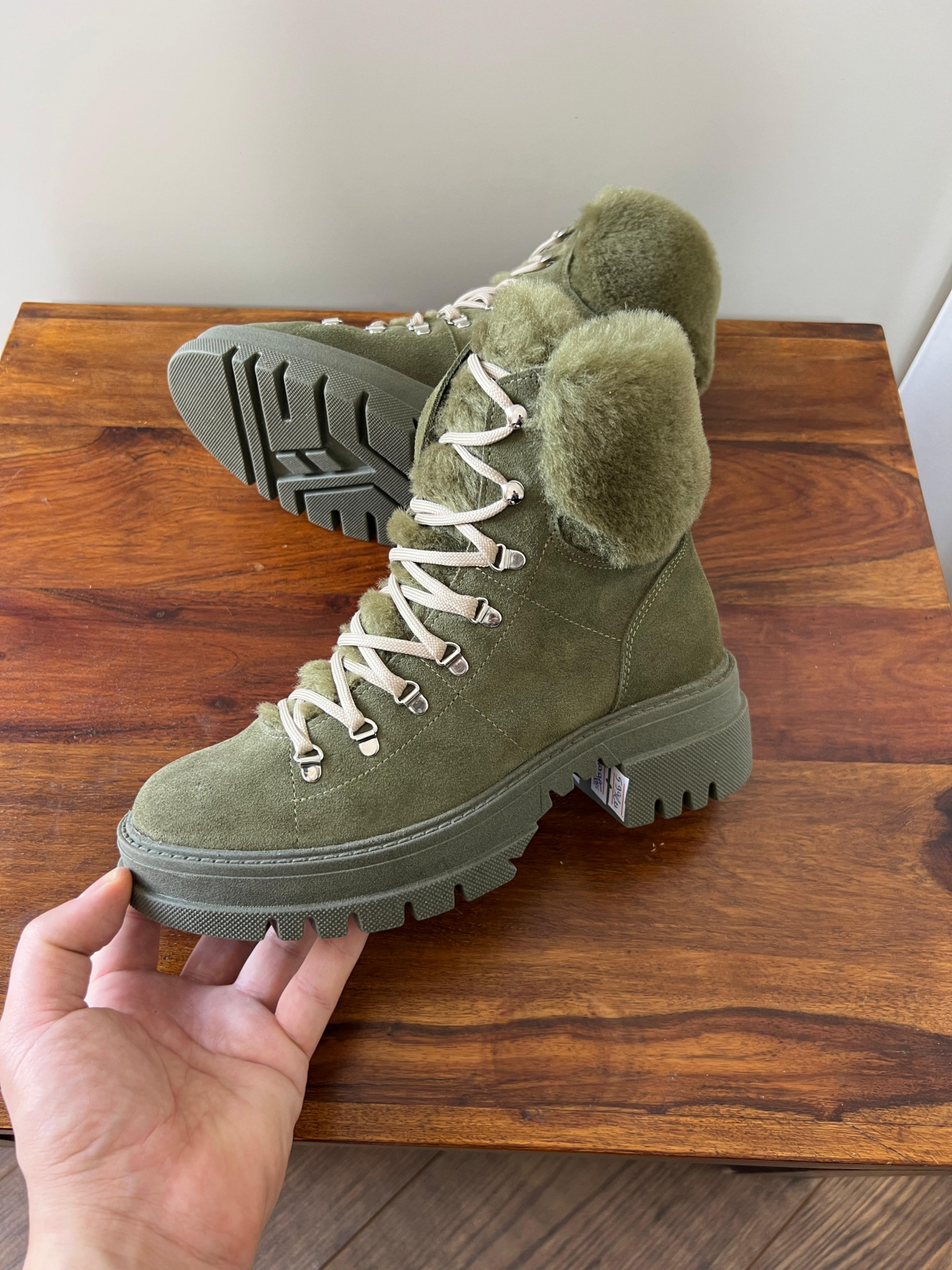 Ghete Amelie din piele intoarsa naturala si blana naturala. Pielea intoarsa si blana au culoarea kaki, iar combinatia cu talpa alb lotus a talpii este una dintre cele mai apreciate de cliente. Inchiderea se face cu siret si capse metalice.