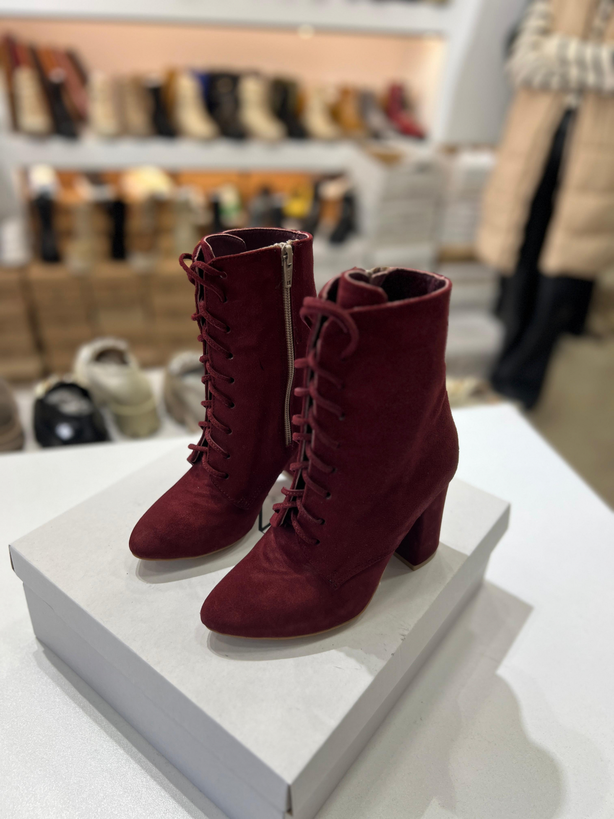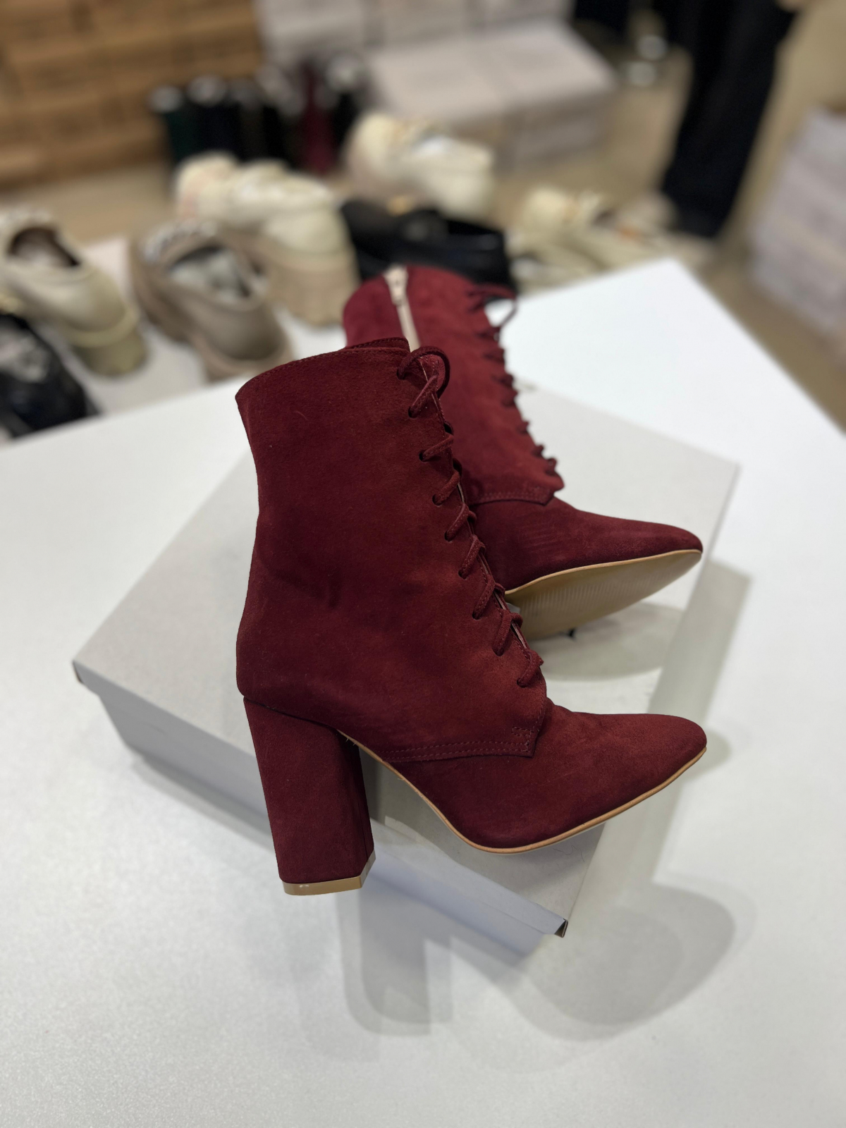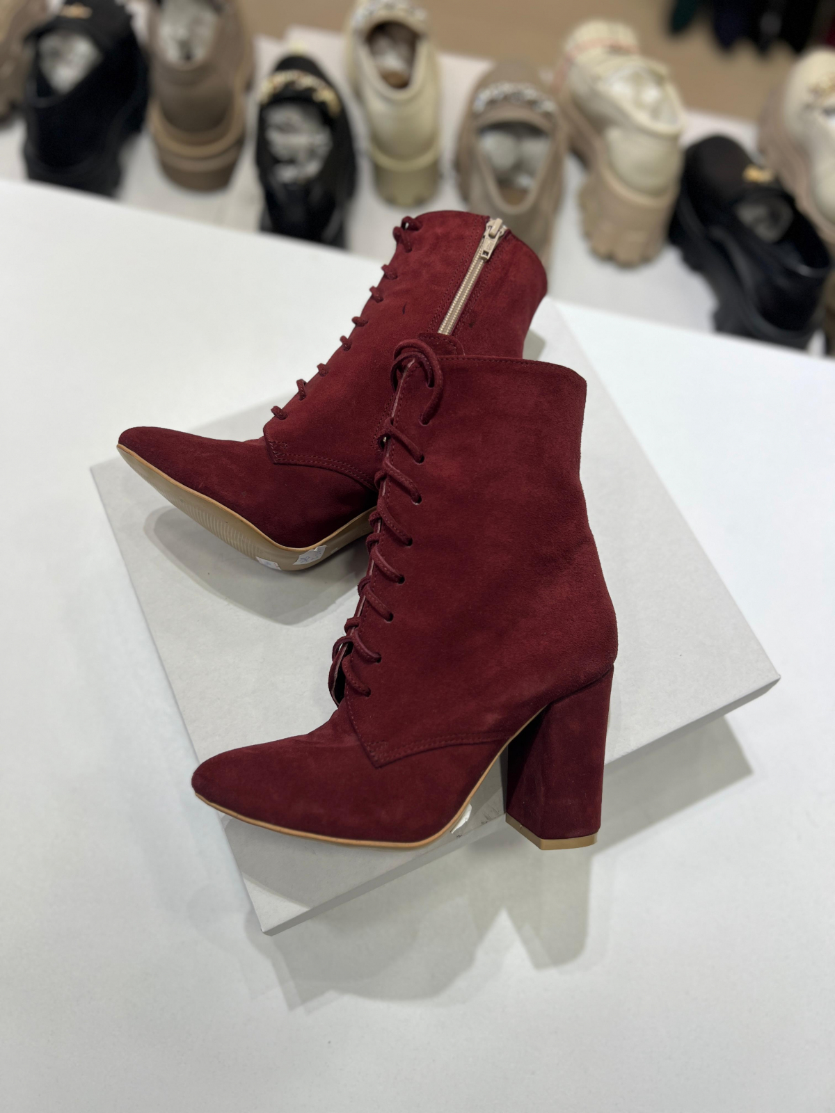 Ghete din piele naturala intoarsa visinie, cu siret si toc gros,foarte stabil, imabracat in piele.Pentru o inchidere mai rapida ghetele sunt prevazut cu fermoar pe partea de lateral interior.
