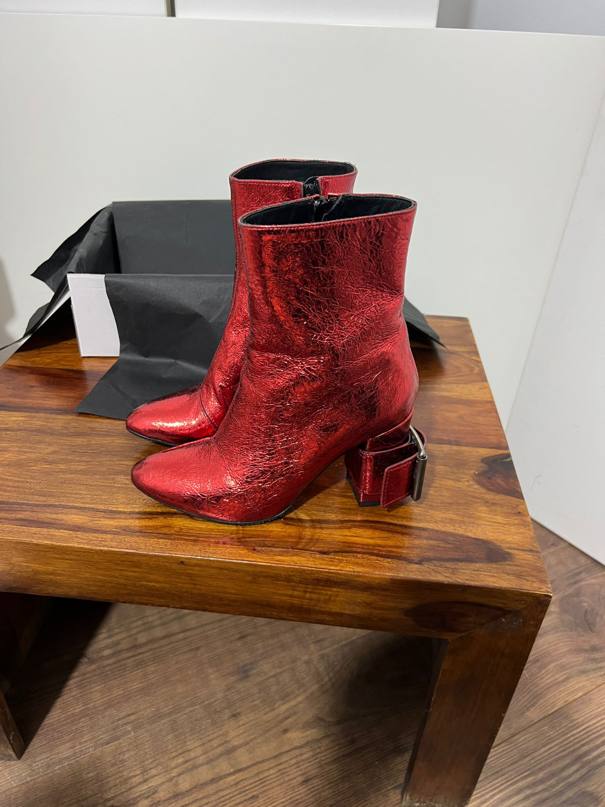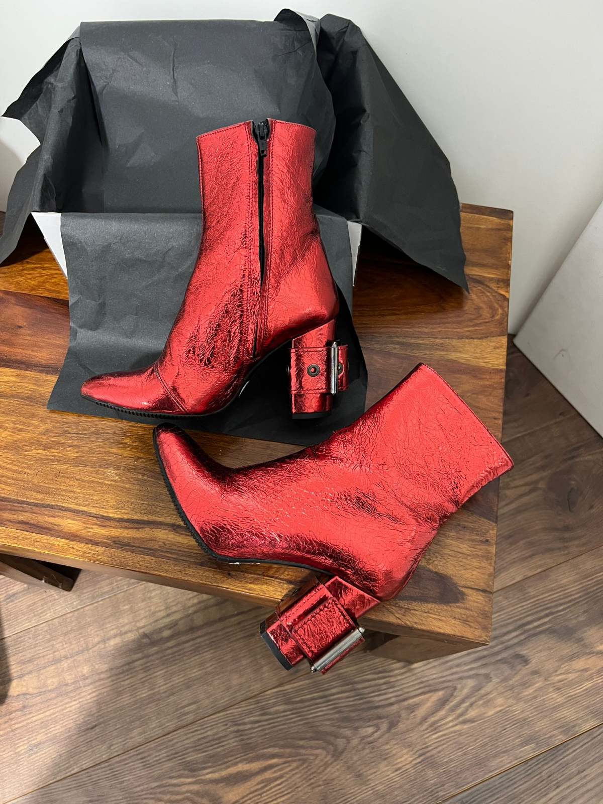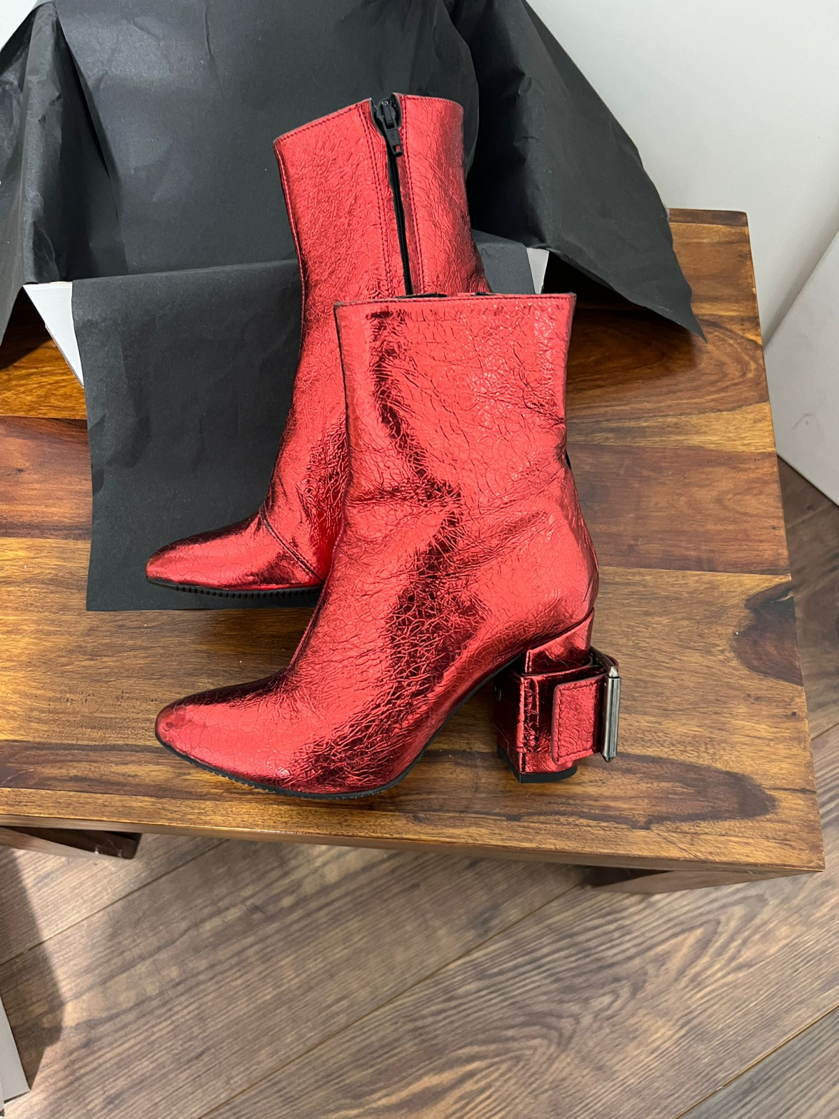 Ghete din piele rosie, cu toc gros de 8.5 cm, ce confera stabilitate.