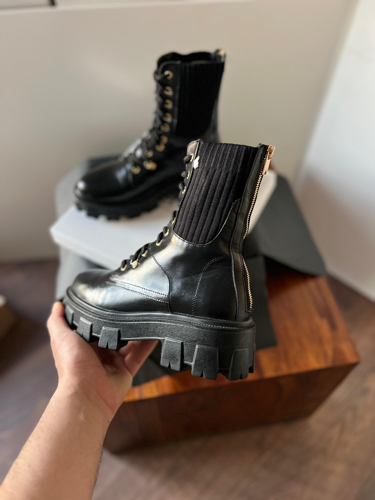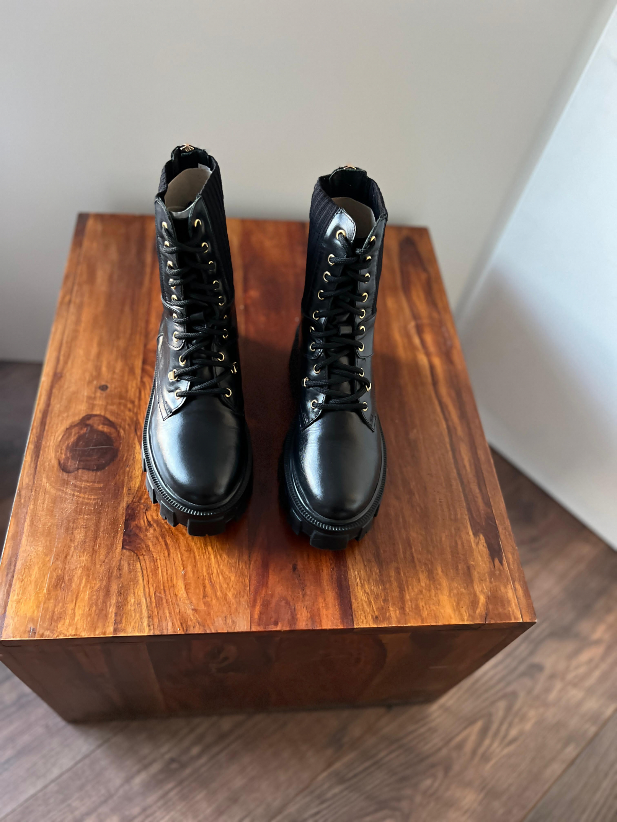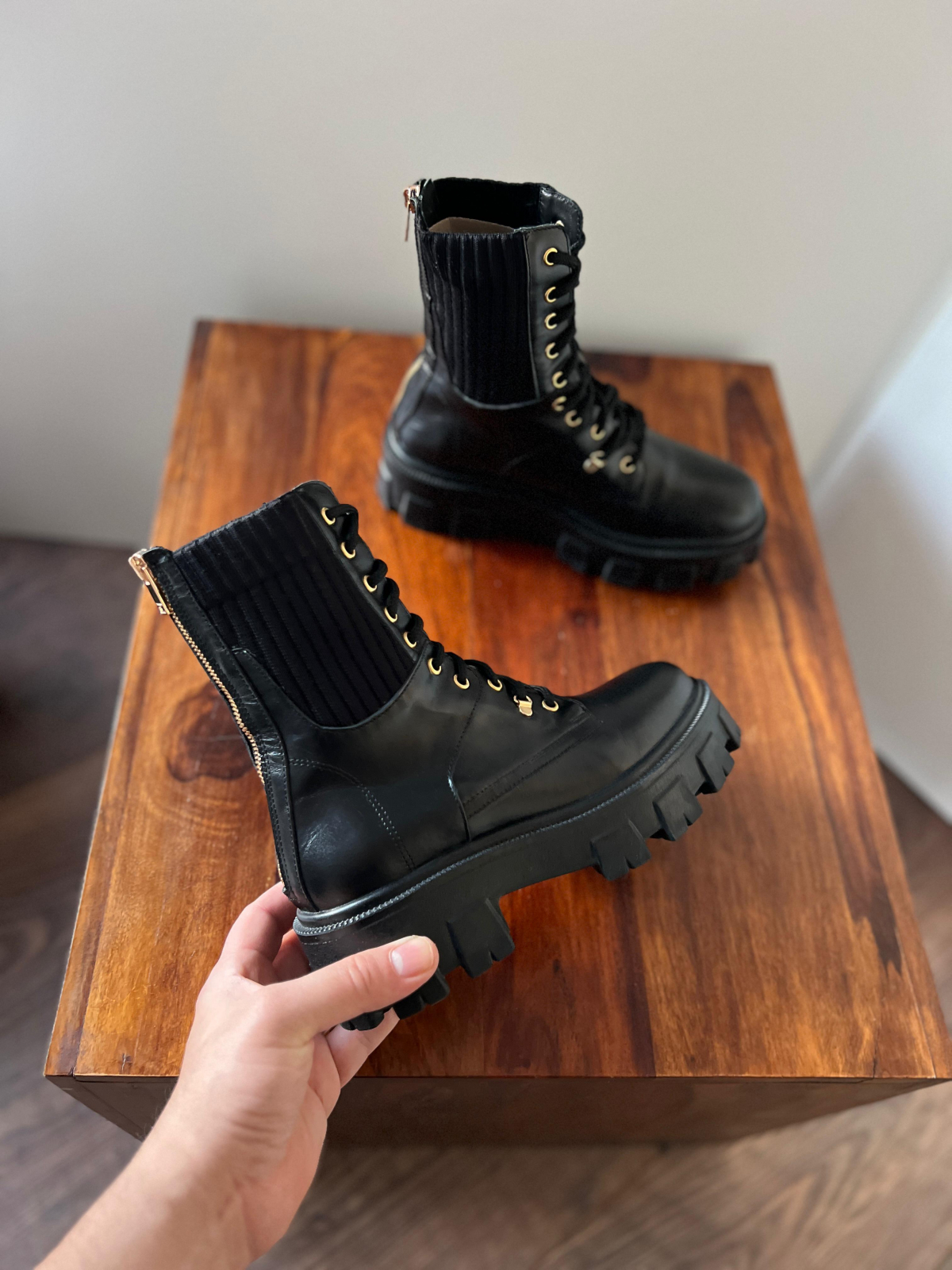 Bocanci cu siret, fermoar si capse metalice aurii, din piele naturala intoarsa, neagra. Inchidrea se face cu siret si cu fermoarul metalic pozitionat in zona din spate.