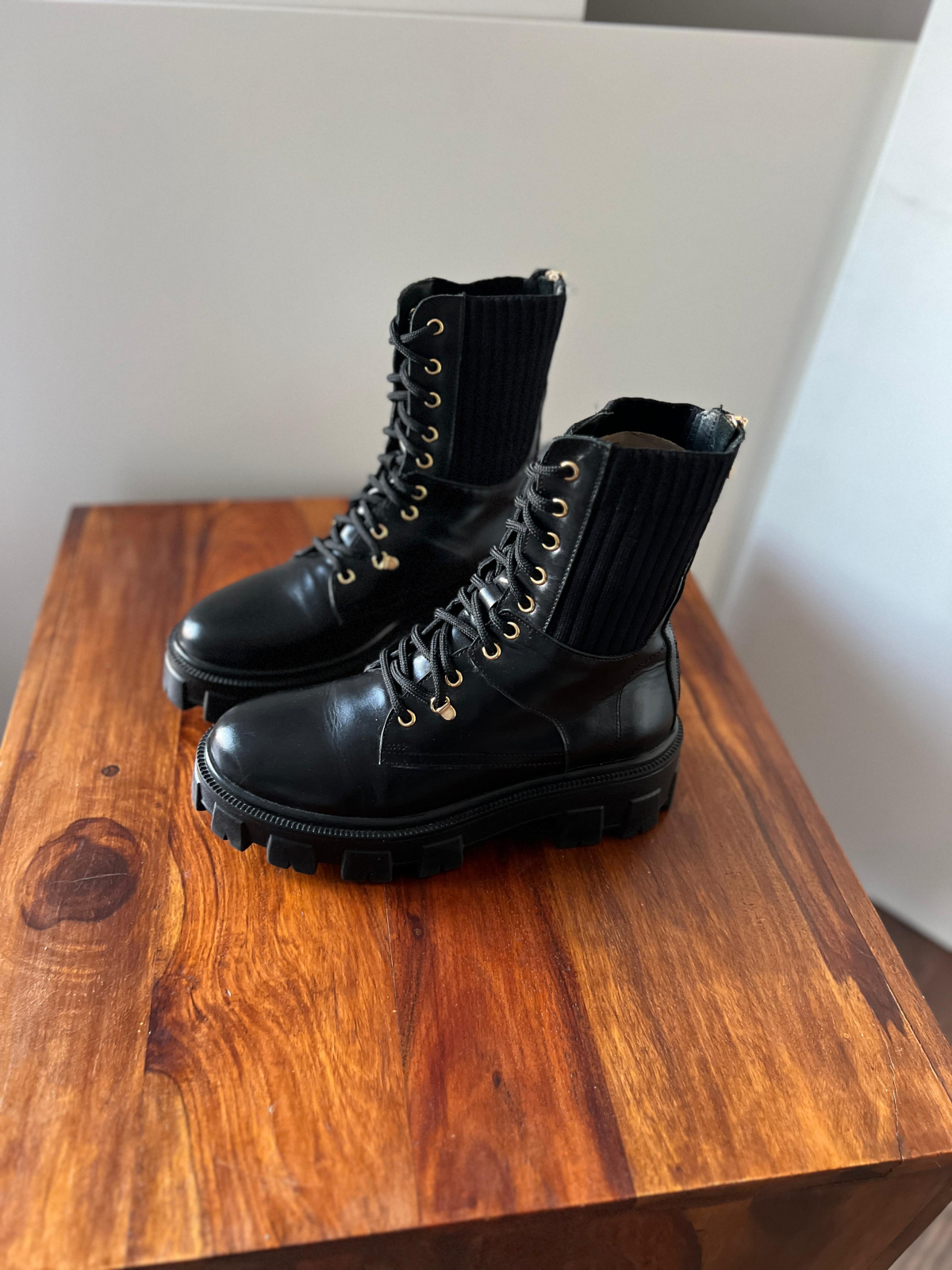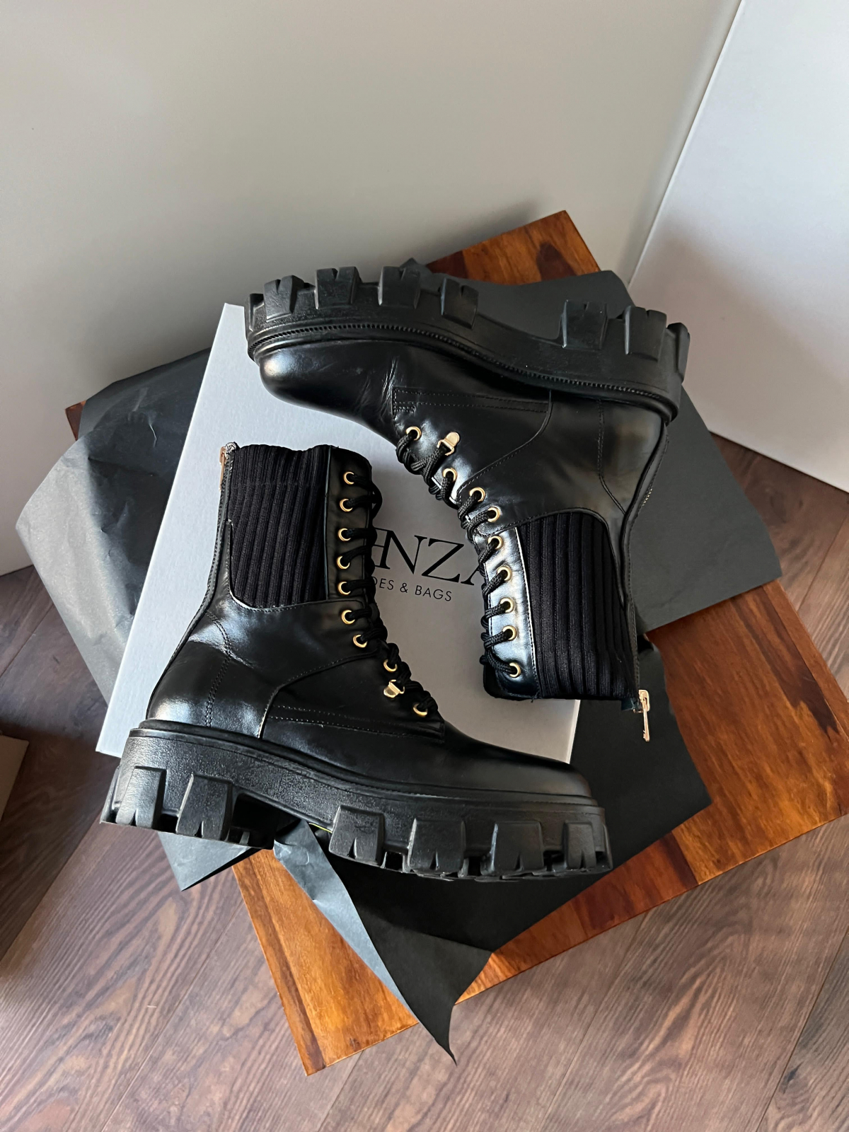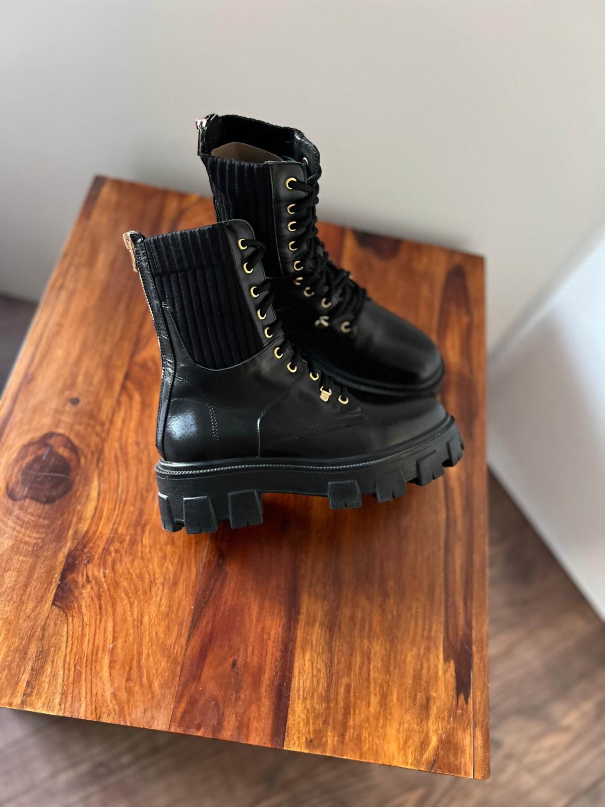 Bocanci cu siret, fermoar si capse metalice aurii, din piele naturala intoarsa, neagra. Inchidrea se face cu siret si cu fermoarul metalic pozitionat in zona din spate.